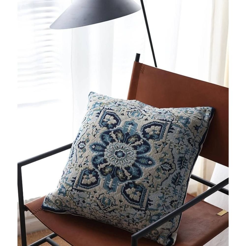 The Azure Kilim Cushion Cover blends calm, heritage-rich blues with intricate Persian-Anatolian motifs, woven into a tapestry-style texture that feels both classic and effortlessly modern. It is a collection you don’t see every day. Moreover, it is designed to complement modern-classic homes, warm minimalist spaces, rustic cottages, boho-luxe corners, and European-inspired interiors with ease. A cushion that uplifts the room instantly — adding depth, character, and quiet luxury while still offering everyday comfort and effortless styling versatility. And unlike ordinary cushion covers, the Azure Kilim Cushion Cover is crafted to last — retaining its rich color, texture, and structure through repeated use.