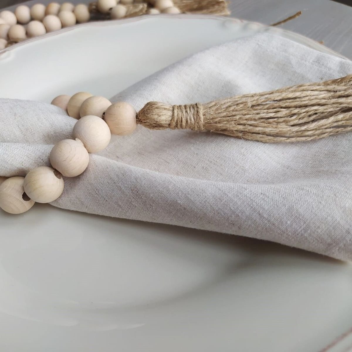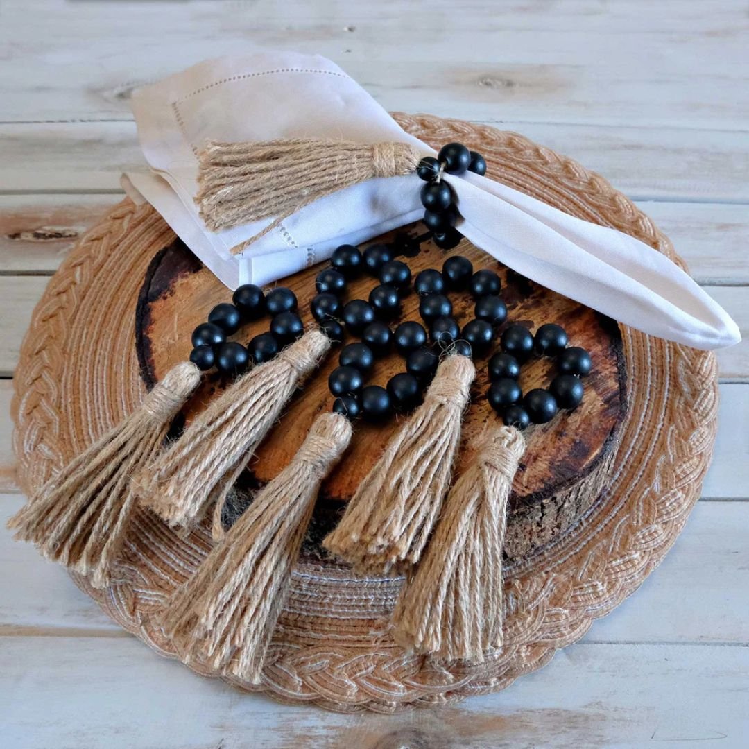 Bohemian Wood Bead Napkin Rings with Jute Tassels (Set of 2)