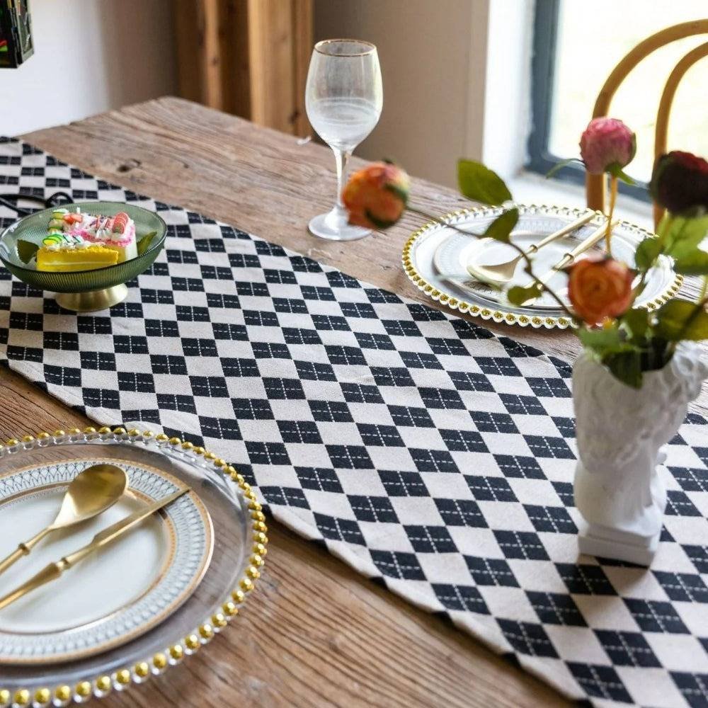 1. Pair the Checkerboard Style Table runner with plain white or cream plates, and add greenery or a single ceramic vase, then use matching or neutral placemats underneath, folded slightly asymmetrical, would give you a casual European look.