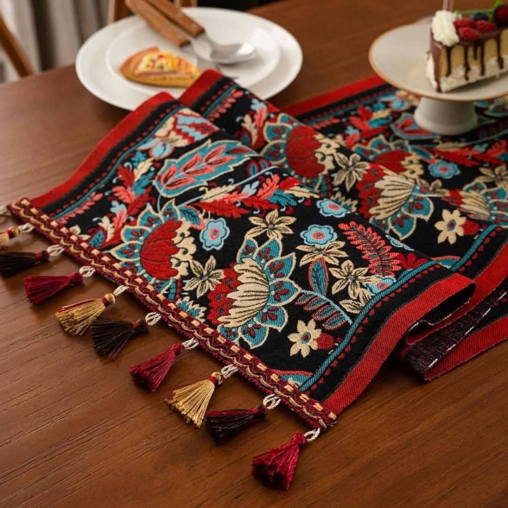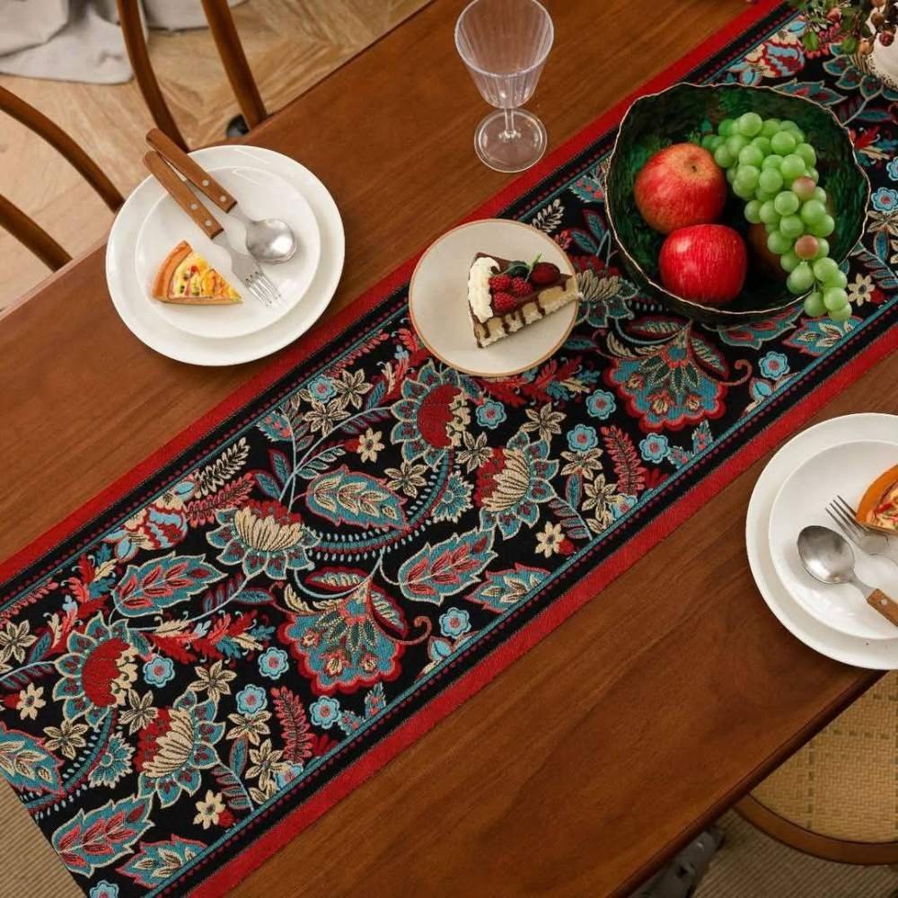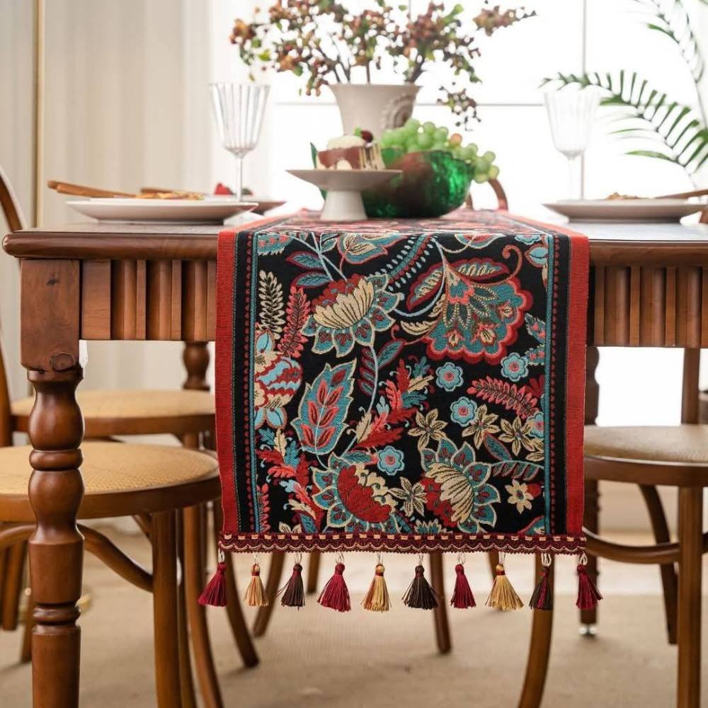 Set the tone for elegant hosting and everyday beauty. Featuring a bold Jacobean floral pattern in rich crimson, teal, and gold on a black backdrop, this woven runner adds timeless charm to dining tables, coffee tables, and festive spaces. Crafted from premium woven fabric, it holds its structure beautifully, with no curling, fraying, or wrinkling. Designed to impress and built to last, this is a timeless piece for those who value refined detail and enduring quality.