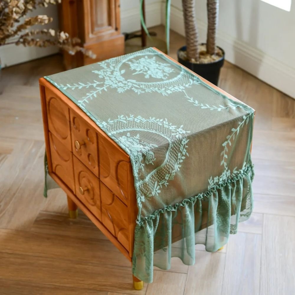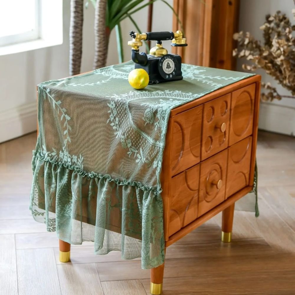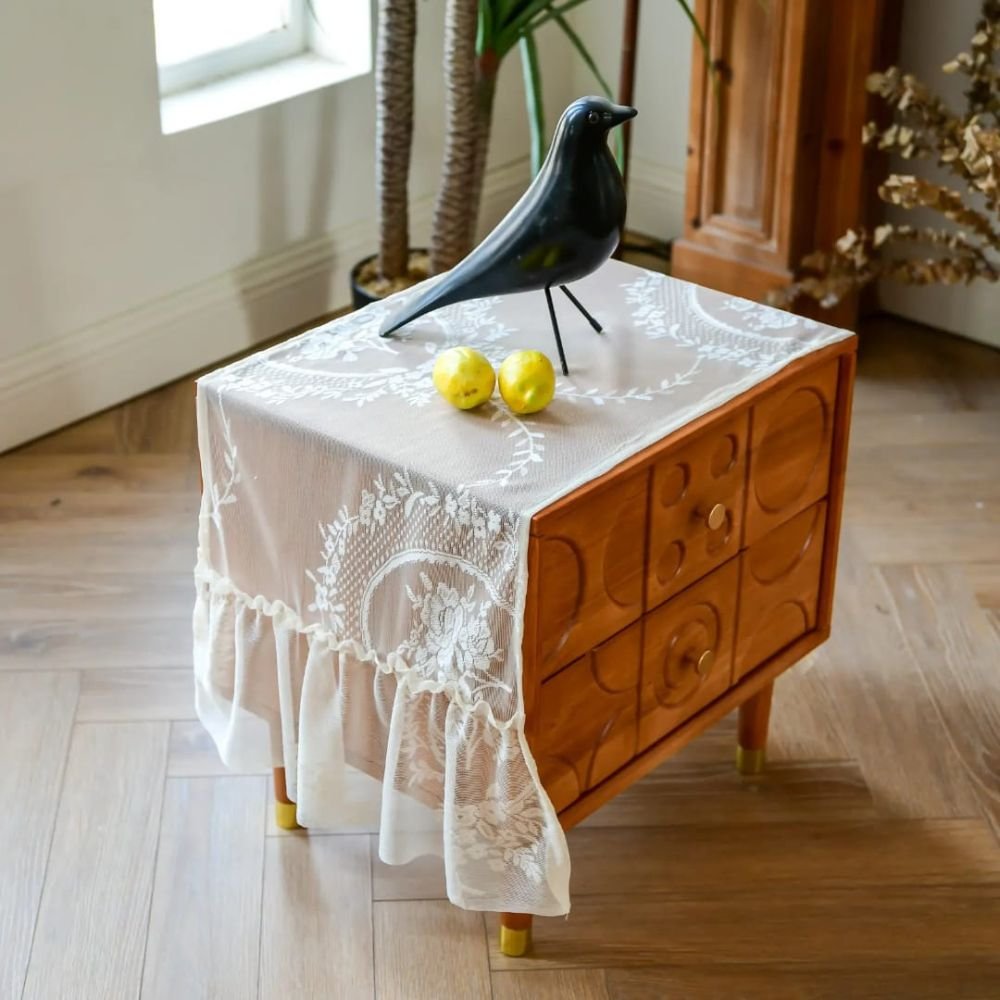 These European Ruffle Lace Nightstand Runners sit at the intersection of vintage European lacework, botanical embroidery, and soft, romantic tailoring, and are finished with draped ruffles. A ruffle is fabric that is gathered, pleated, or lightly folded along the edges to create soft waves or frills—used as a decorative finish that adds movement and softness rather than stiffness.