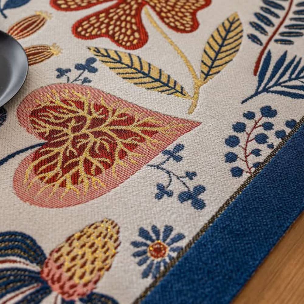 Our Evening Evening Bloomscape Jacquard Placemats features a vibrant floral pattern, earth-toned botanical illustrations, and a deep navy border that bring a burst of botanical charm to your dining space. Perfect for everyday dining or special gatherings, these placemats add both color and character to your table.