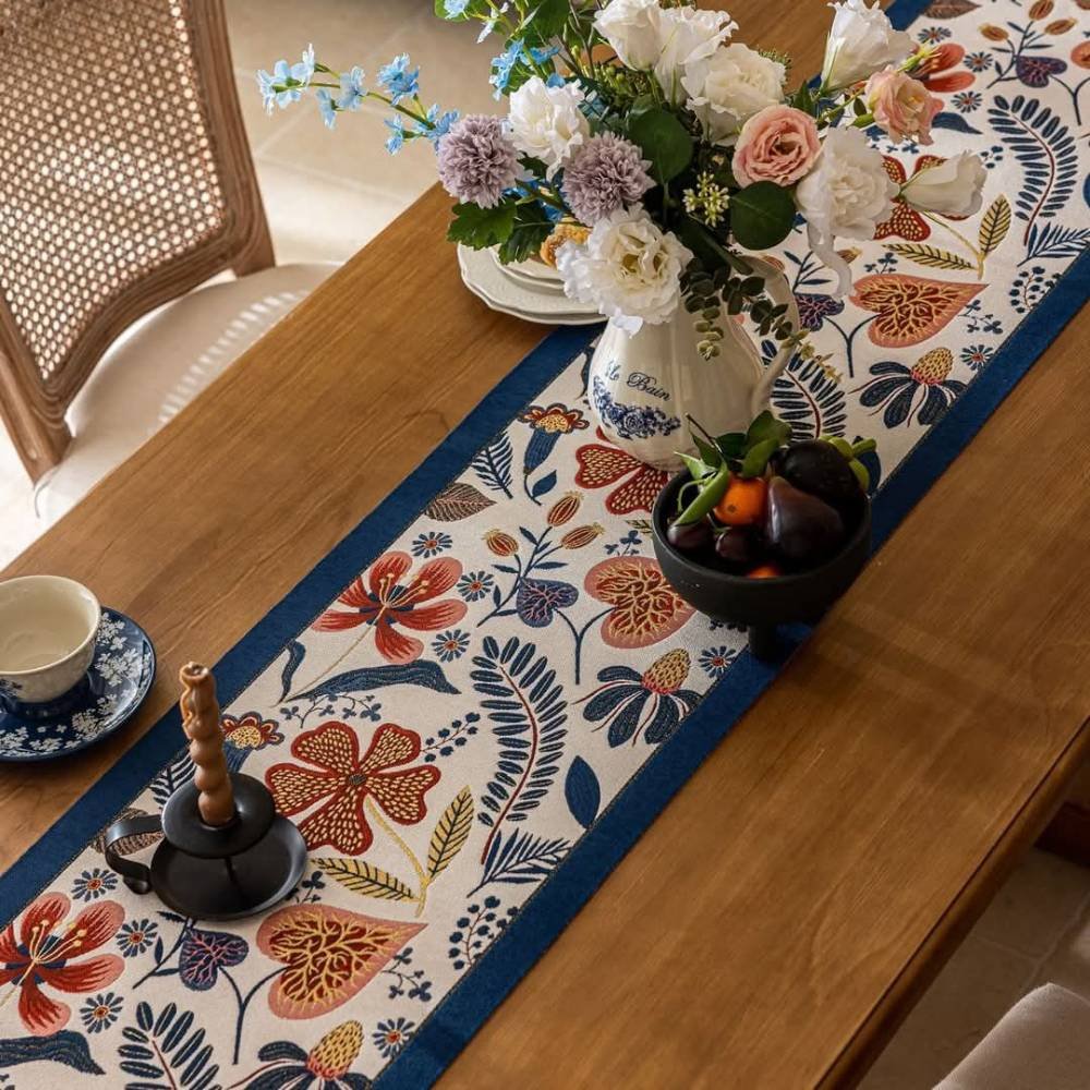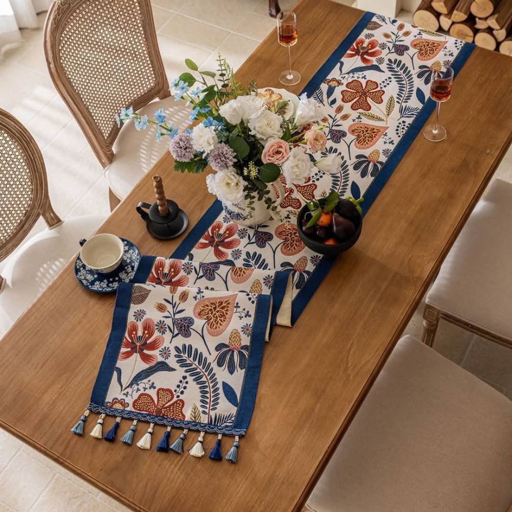 Our Evening Bloomscape Jacquard Table Runner features a vibrant floral pattern, earth-toned botanical illustrations, a deep navy border, and hand-tied multi-colored tassels that bring a burst of botanical charm to your dining space. Perfect for everyday dining or special gatherings, this runner adds both color and character to your table.
