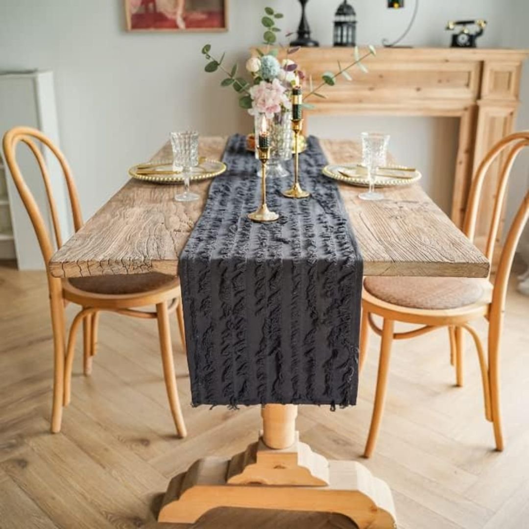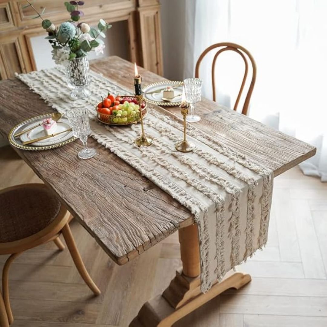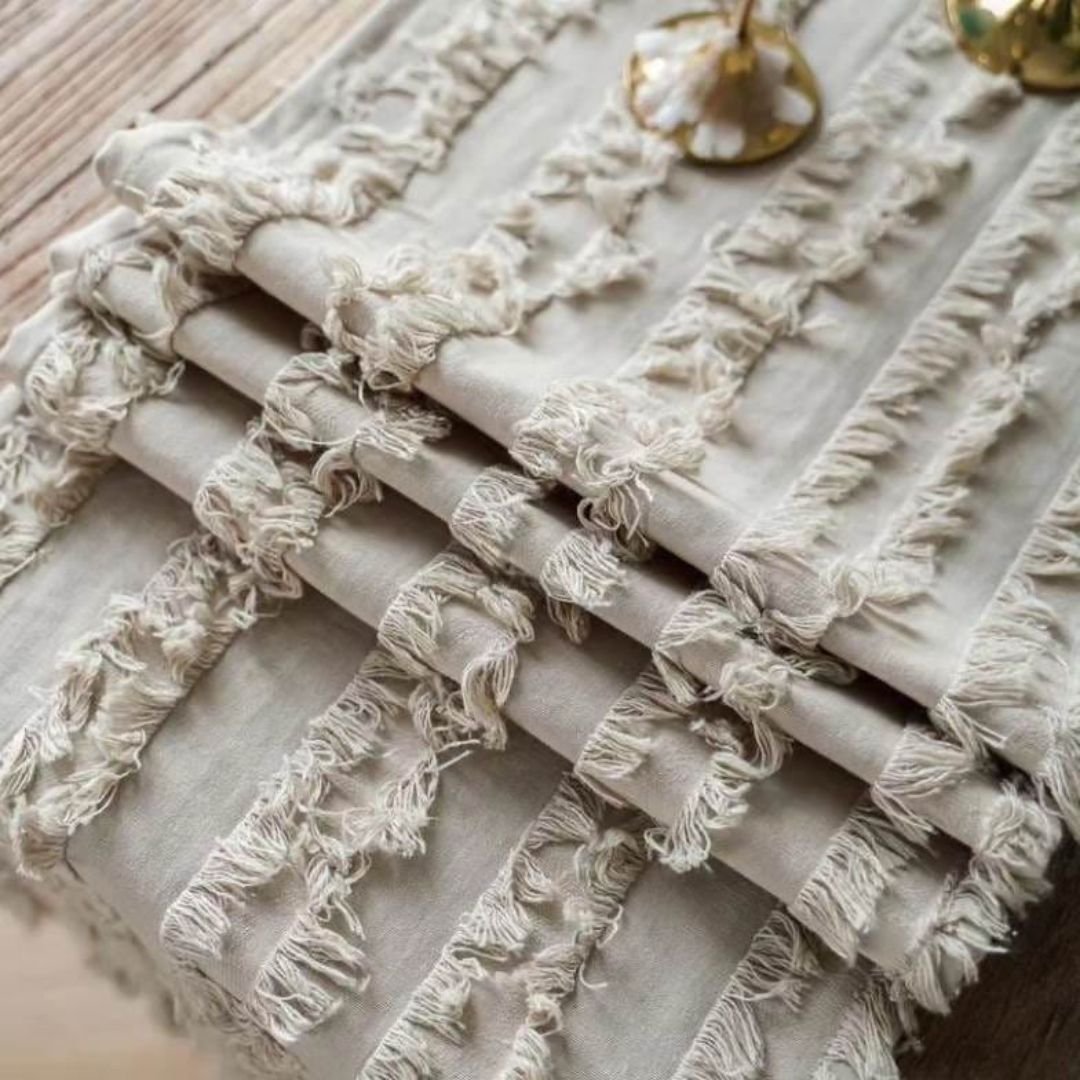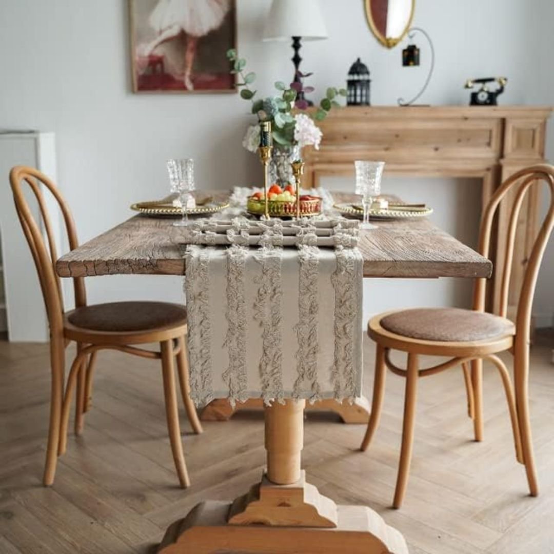 The stunning design of this table runner is achieved by unique carved pile fabrics. Our Fringed Striped Farmhouse Style Table Runner features a charming rustic design with macrame embroidery, which adds a touch of elegance and chic charm to any dining setting.