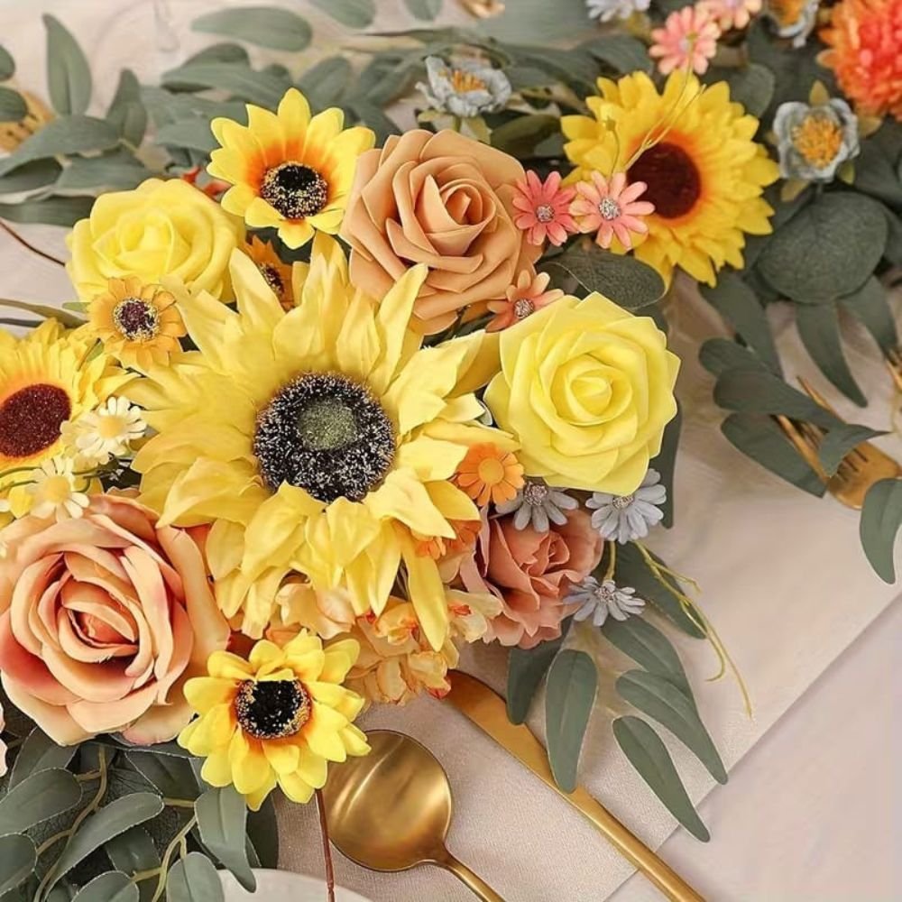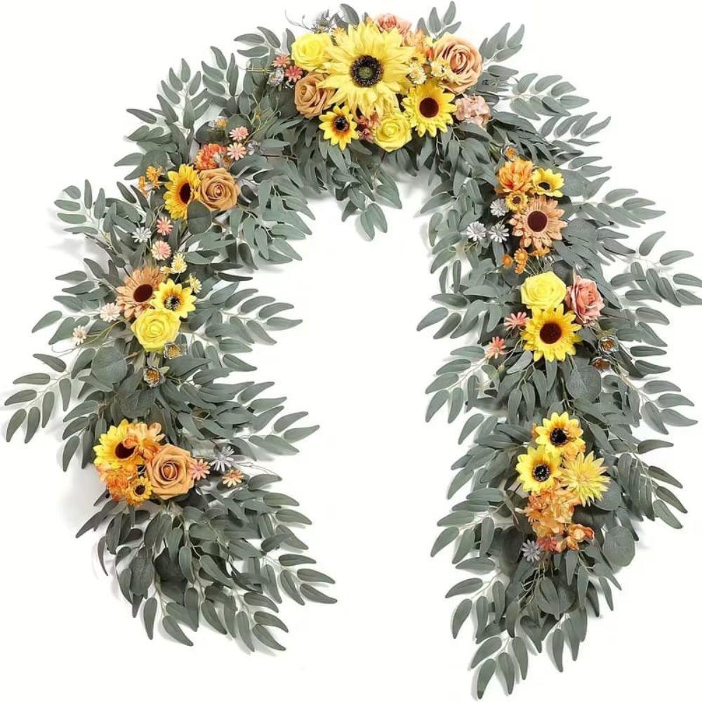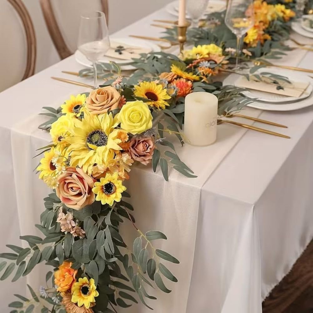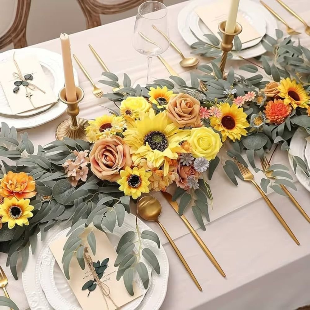 Designed to bring the relaxed beauty of an open garden onto the table, the Garden-Scape Table Garland introduces natural flow, movement, and warmth to curated tablescapes. With its cascading form and softly layered florals, such as Sunflower, Rose, Petals, Daisy, with soft Fern and Eucalyptus leaves, along with a trailing vine. Hence, it transforms a simple table into a visually engaging setting without overwhelming the space.