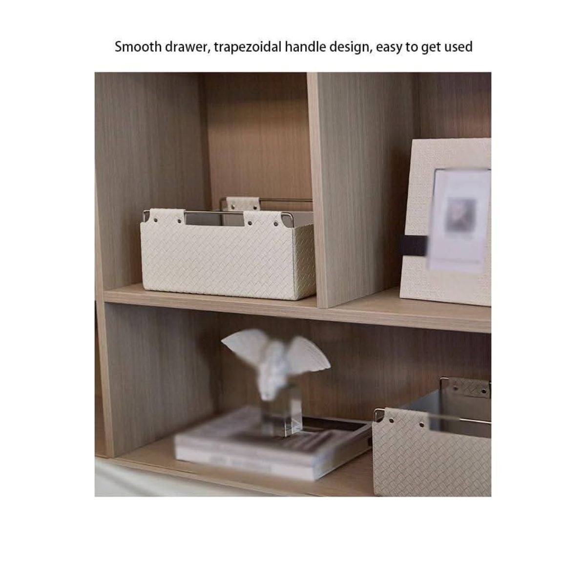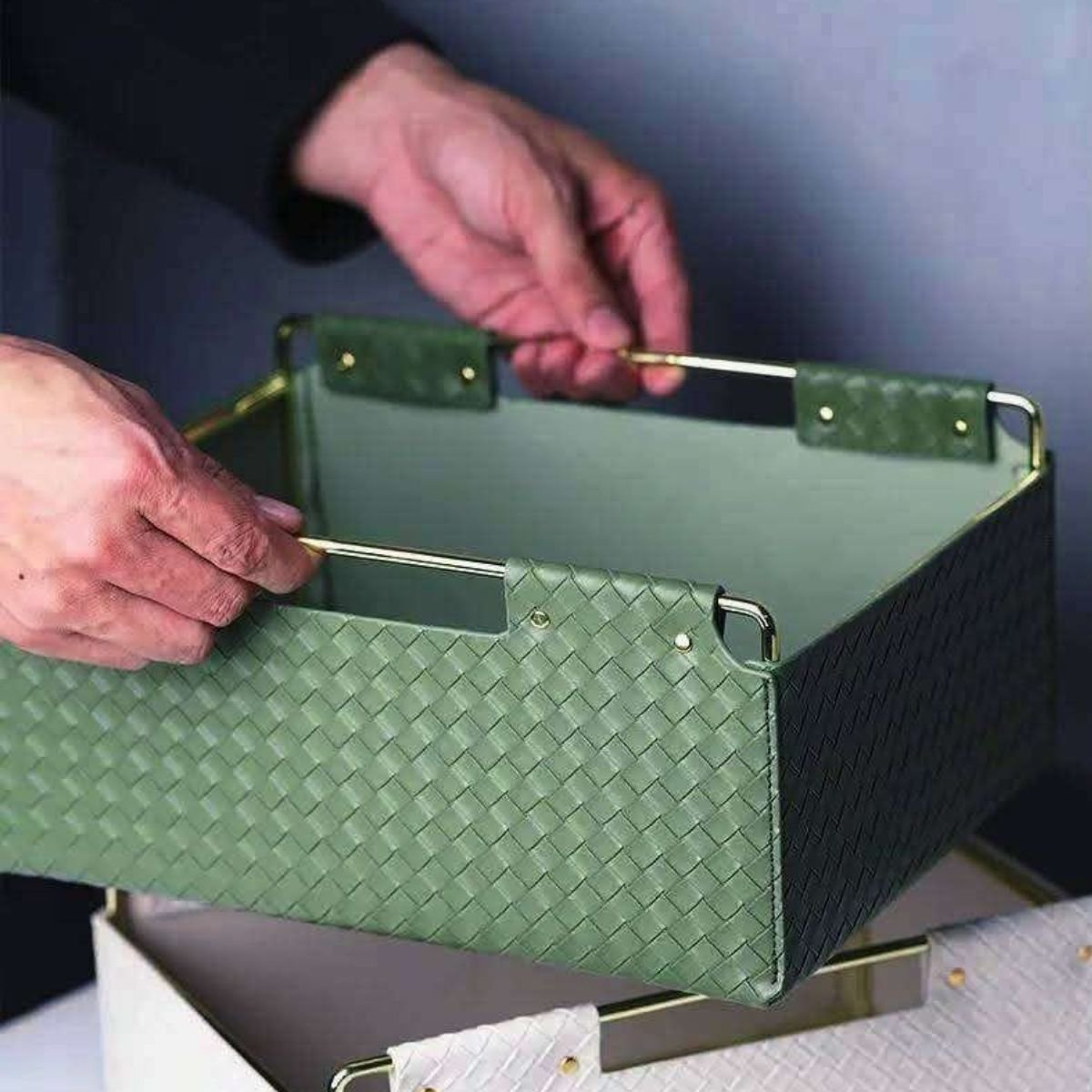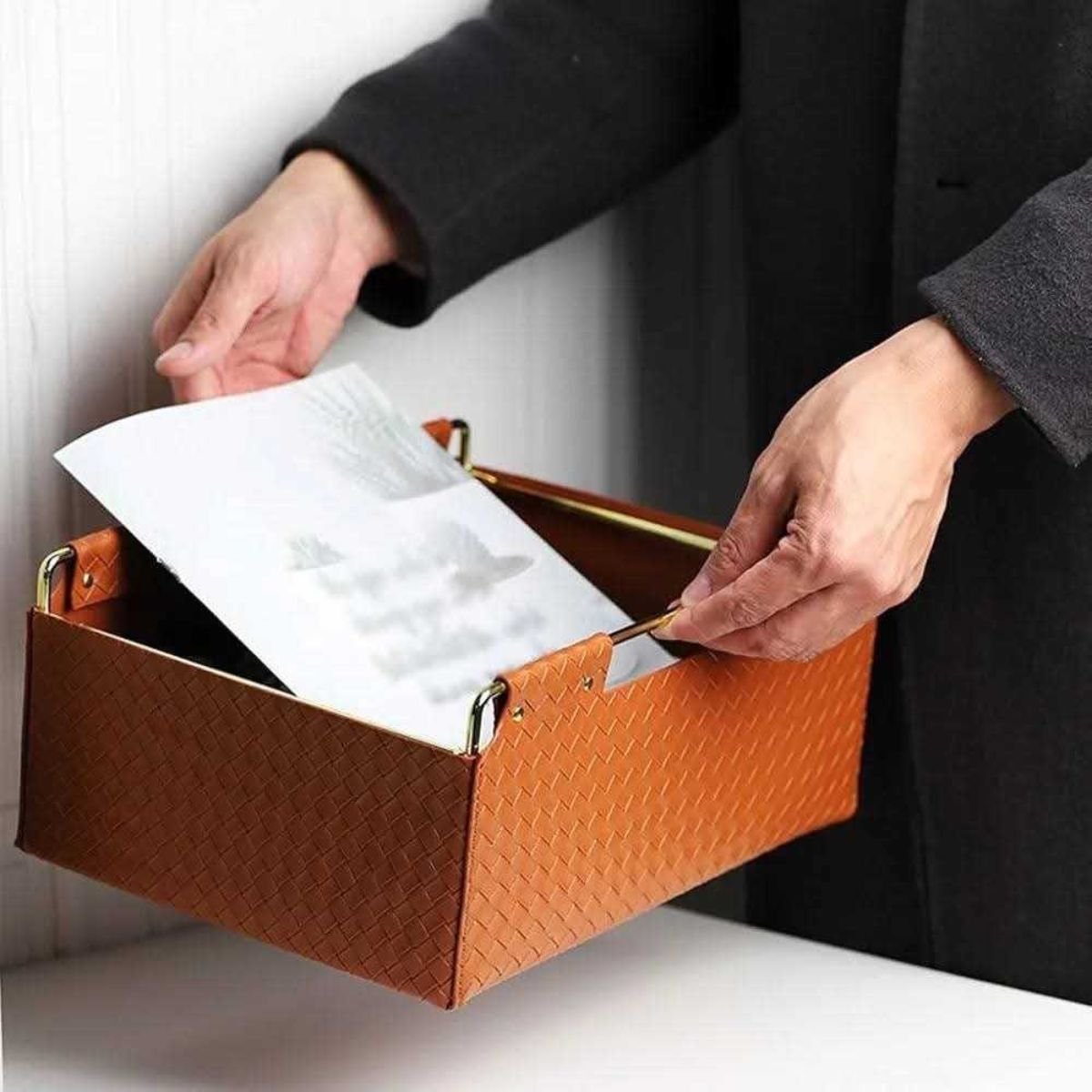 Small space? Big mess? Large Urban Weave Leather Organizers tame it all, with a touch of modern artisanal flair. Featuring a stylish woven pattern leather body and sleek gold metal frame, they are perfect for organizing your essential items, such as books, makeup, pens, jewelry, cosmetics, sticky notes, paperclips, and other supplies. They are ideal for desks, coffee tables, or nightstands—keep your essentials tidy and within easy reach, all while upgrading your decor.