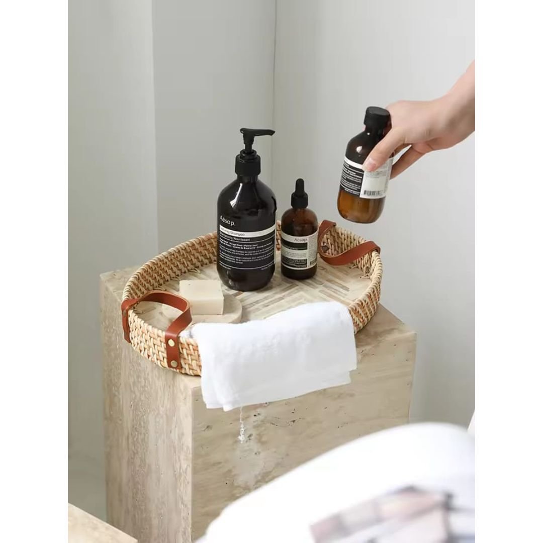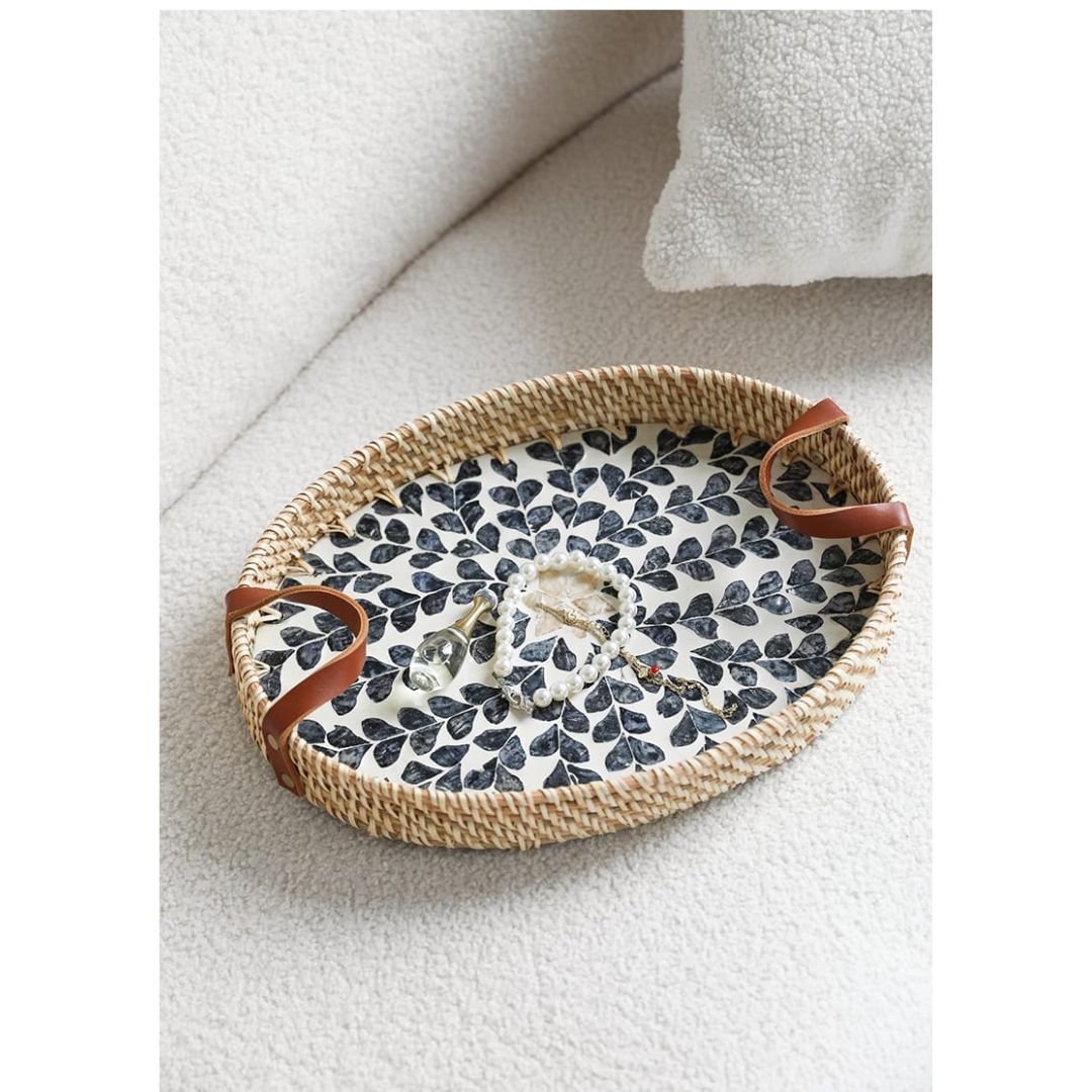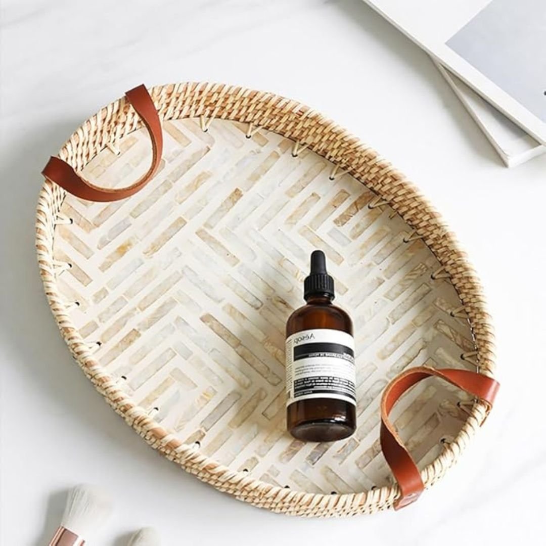 This Oval Seashell Leather Handle Storage Basket/Tray is 100% handmade. The frame is woven from natural rattan, the bottom layer is inlaid with natural mother-of-pearl, and the lower layer is made of wooden base. The organic structure along with the neutral colors can be easily matched with all styles of decoration, be it farmhouse, modern, or rustic.