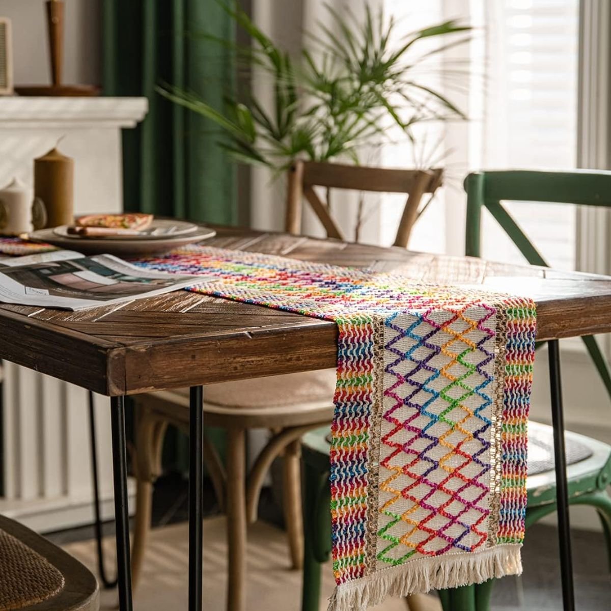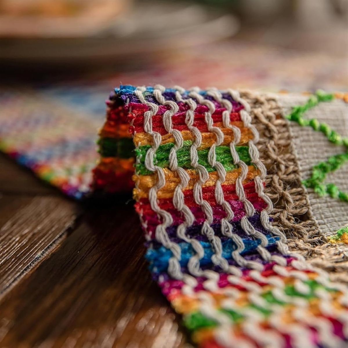 Bring joyful color to your table with the Rainbow Fiesta Weave Table Runner. Crafted from a Premium cotton-linen blend and inspired by bohemian artistry, this piece blends texture, tradition, and modern elegance. This Runner will turn every table into a curated experience. Suited for homes that speak in style.