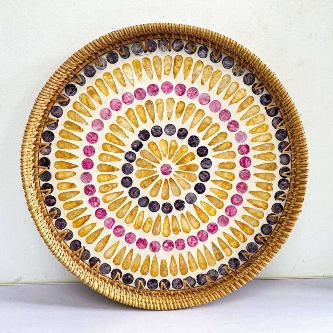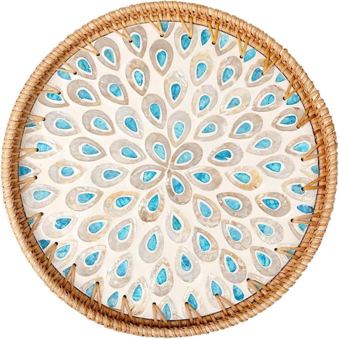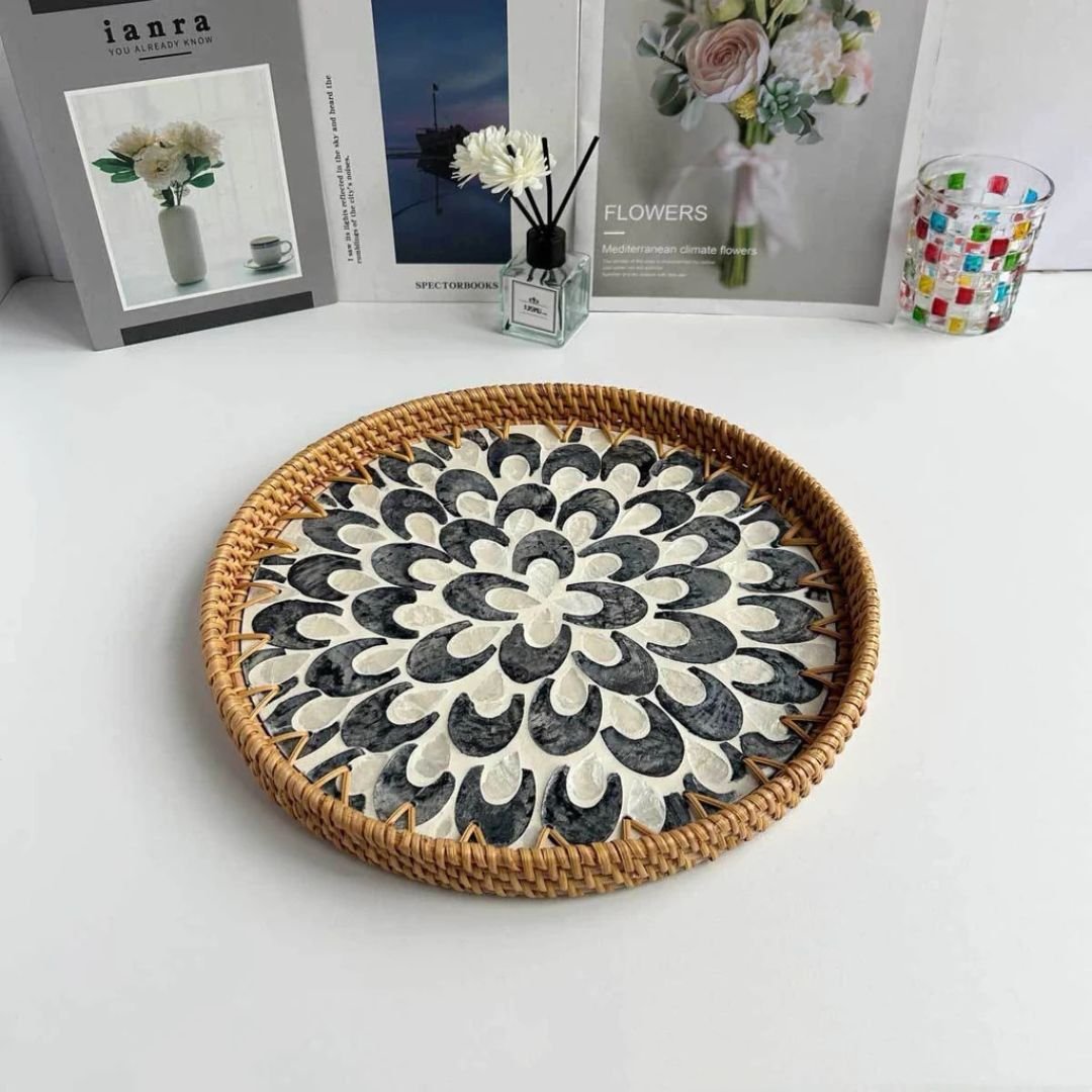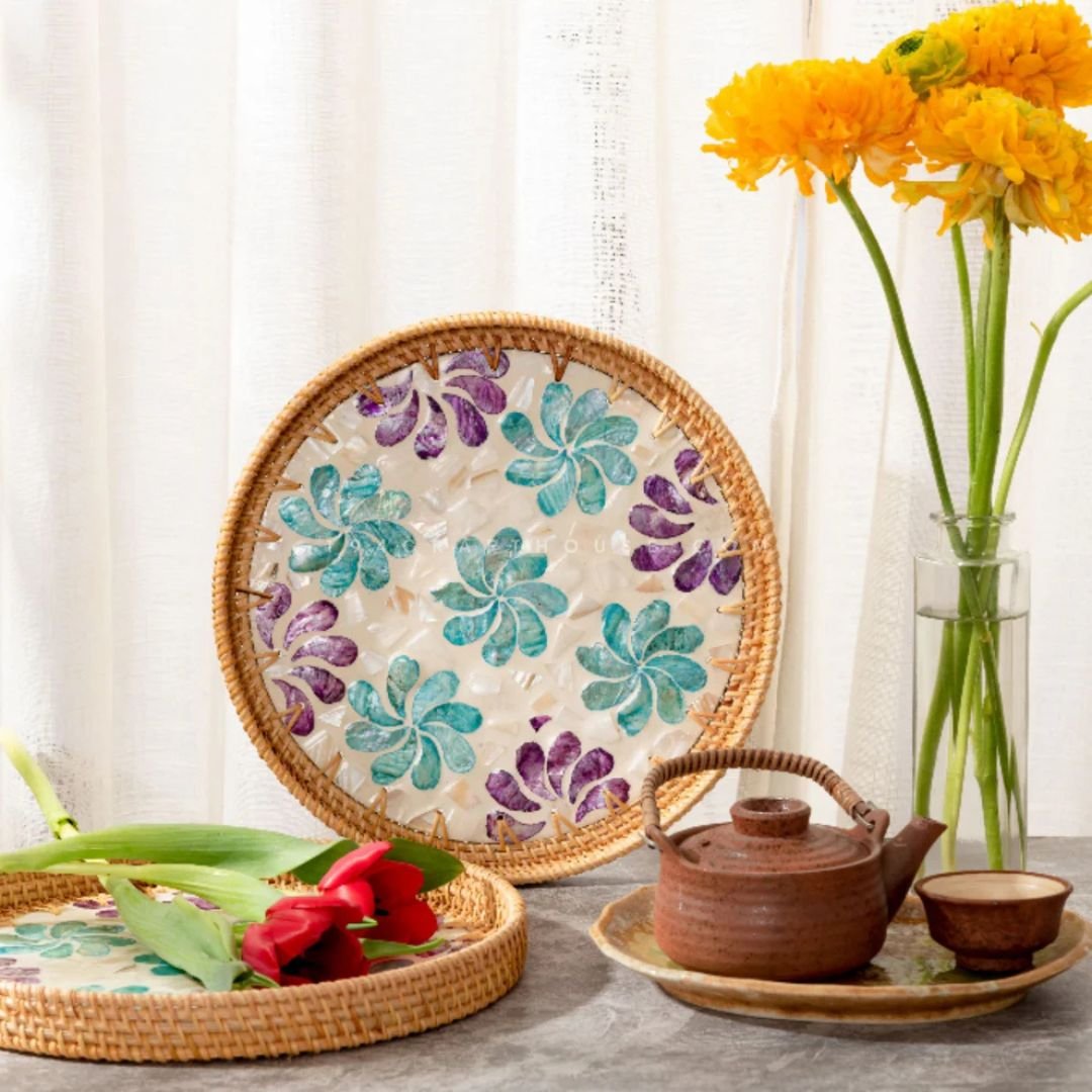 Round Pearl Inlay Rattan Trays