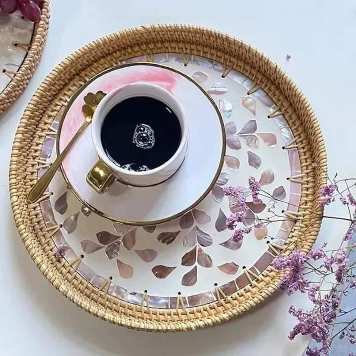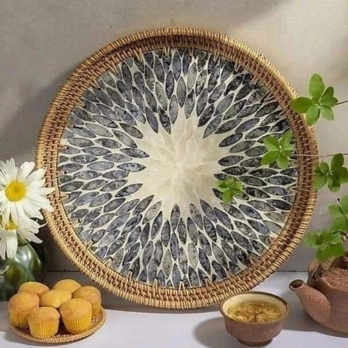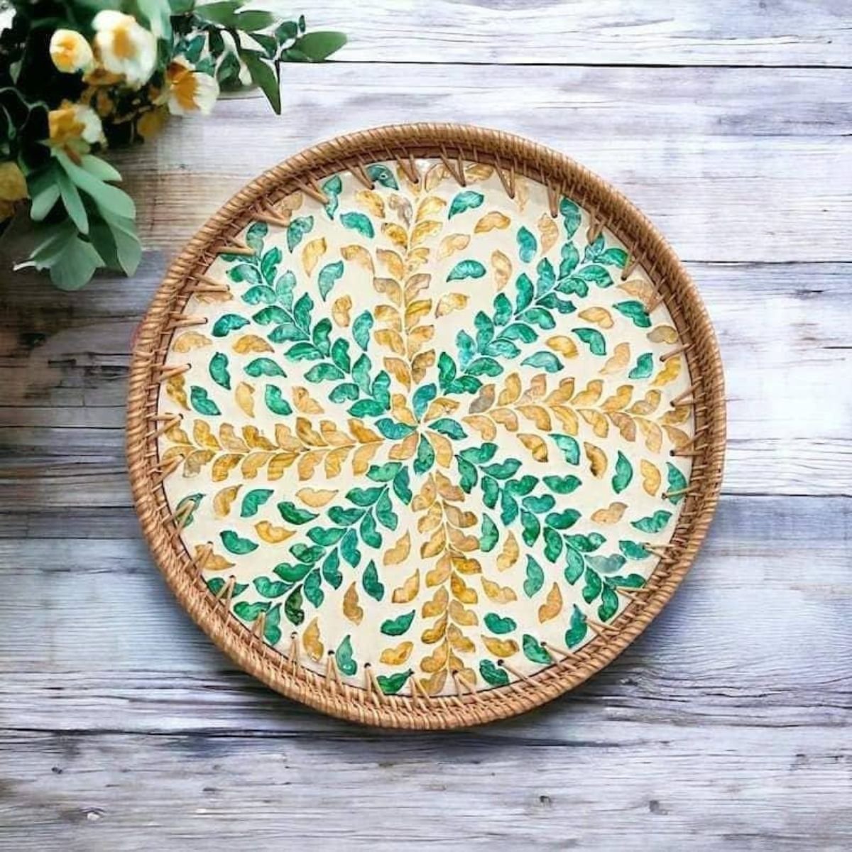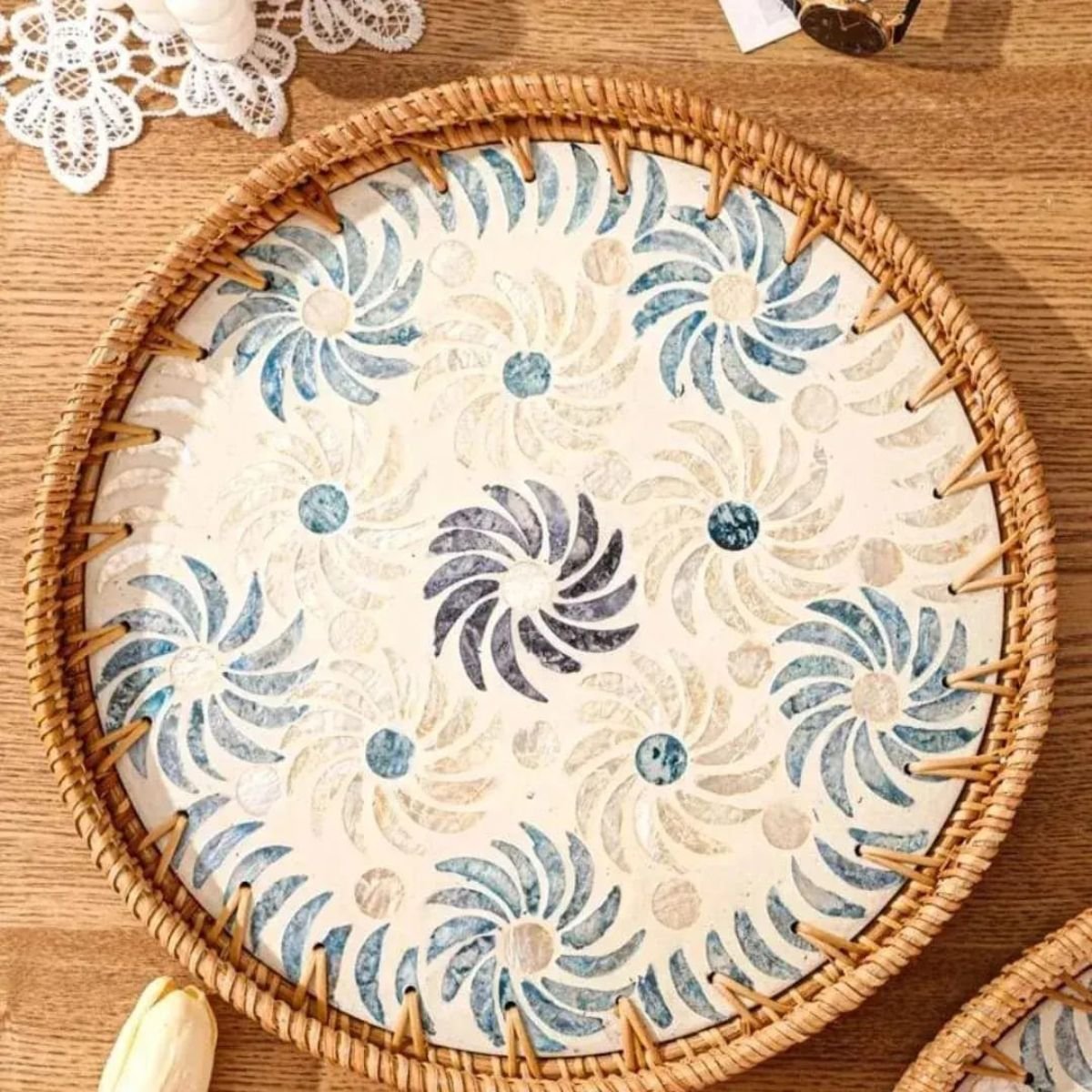 Round Pearl Inlay Rattan Trays