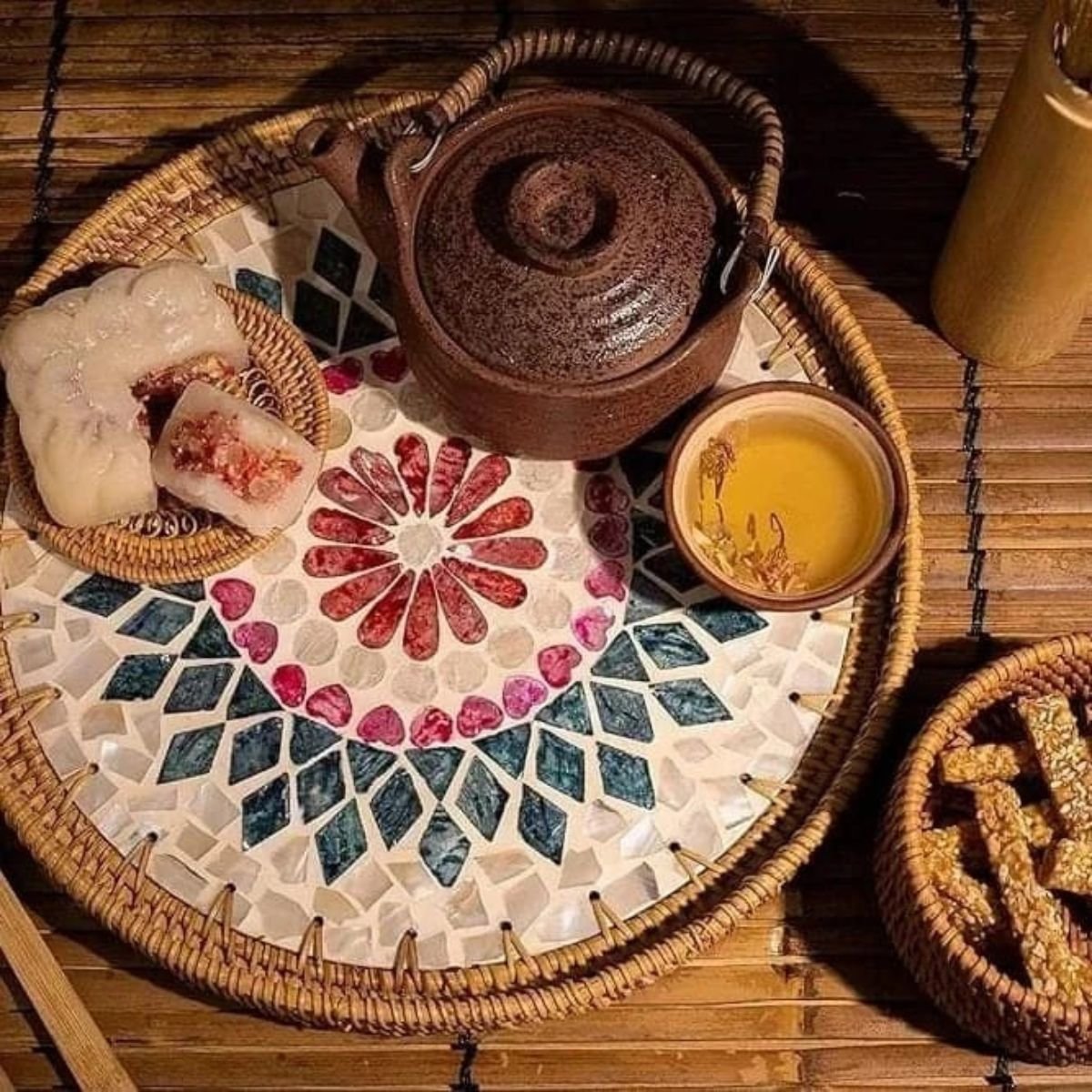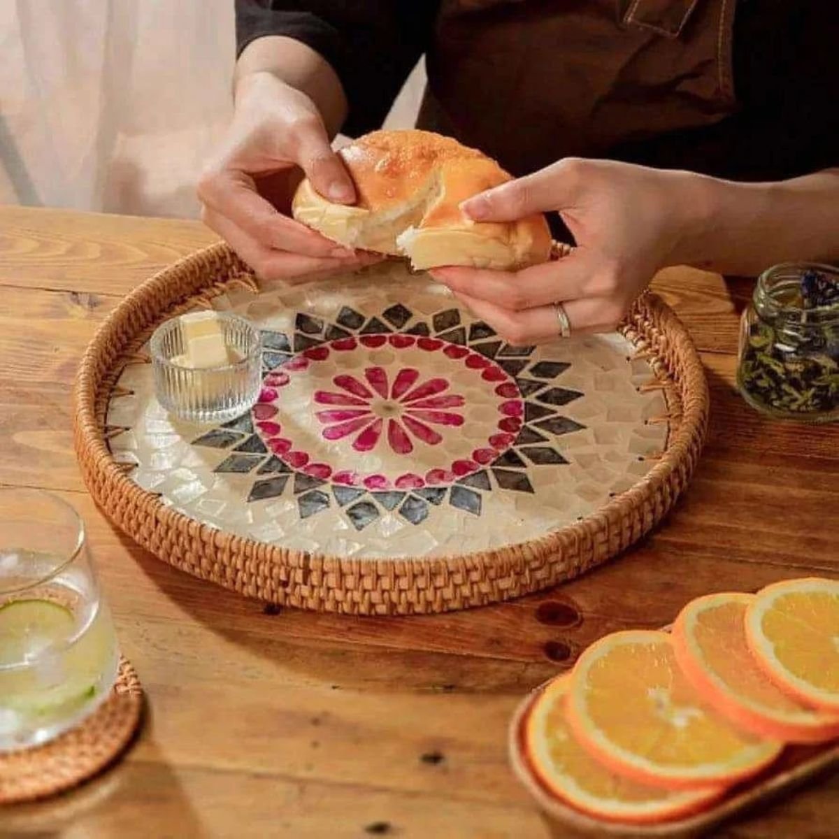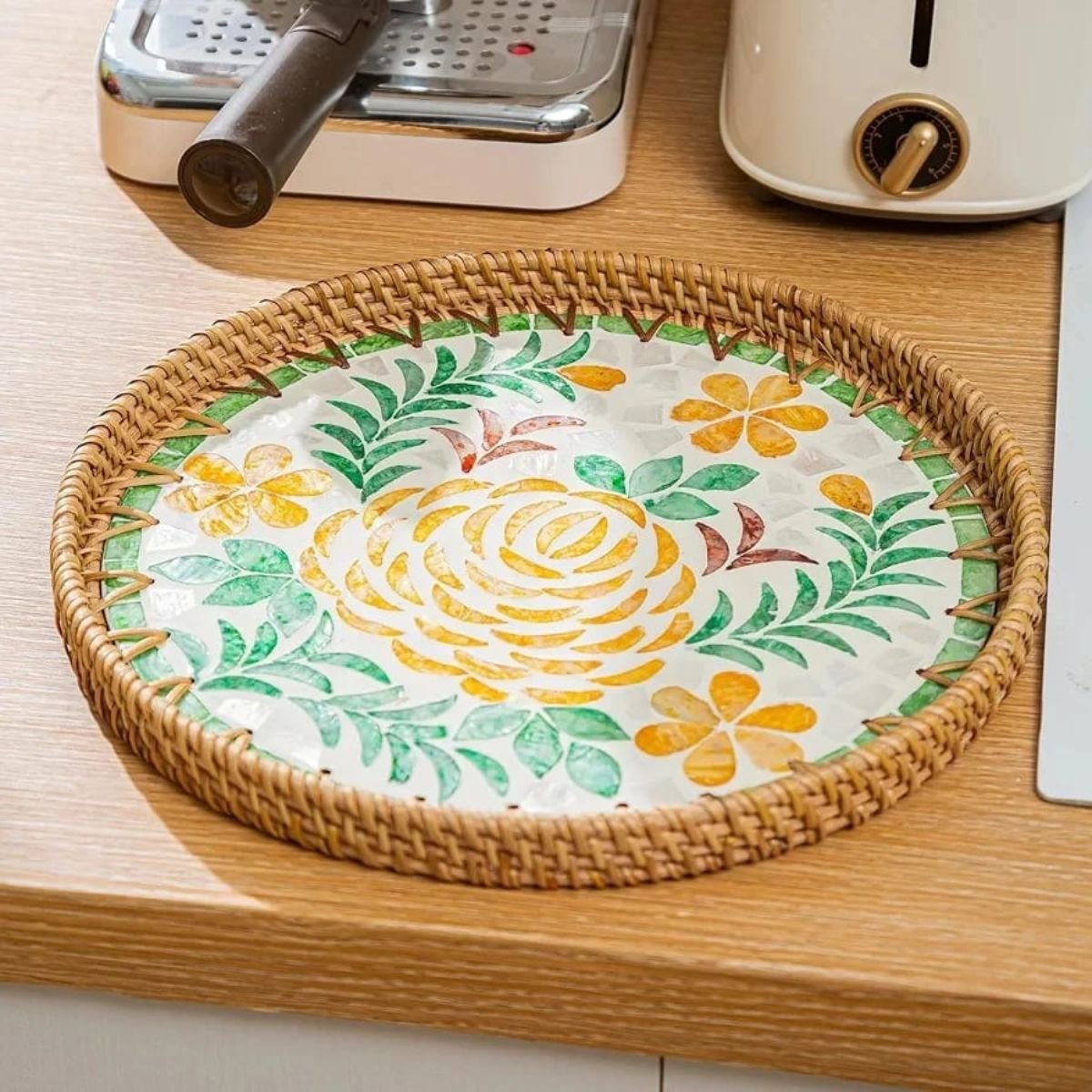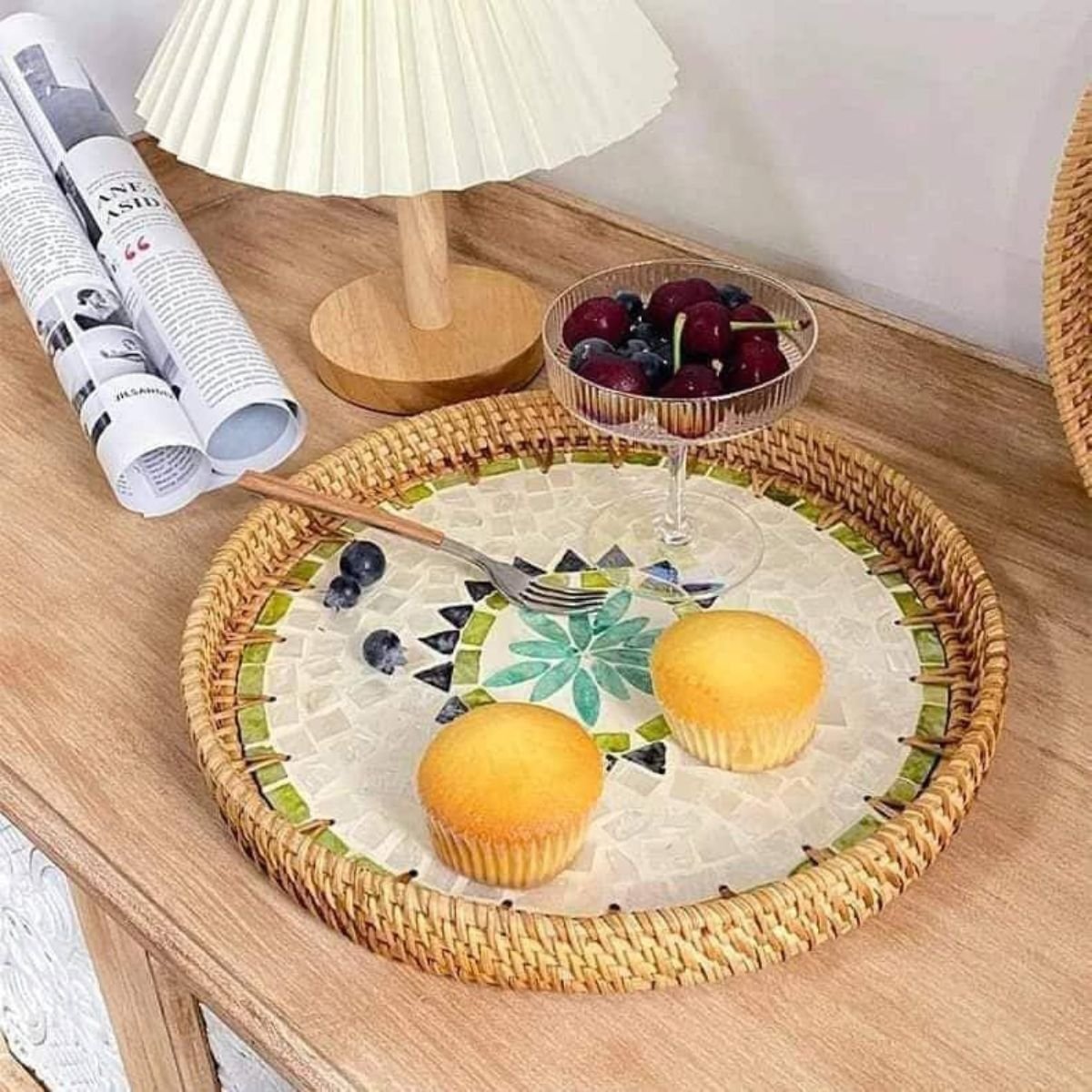 Round Pearl Inlay Rattan Trays
