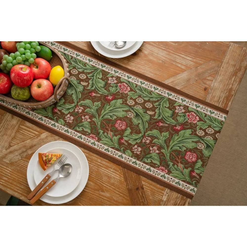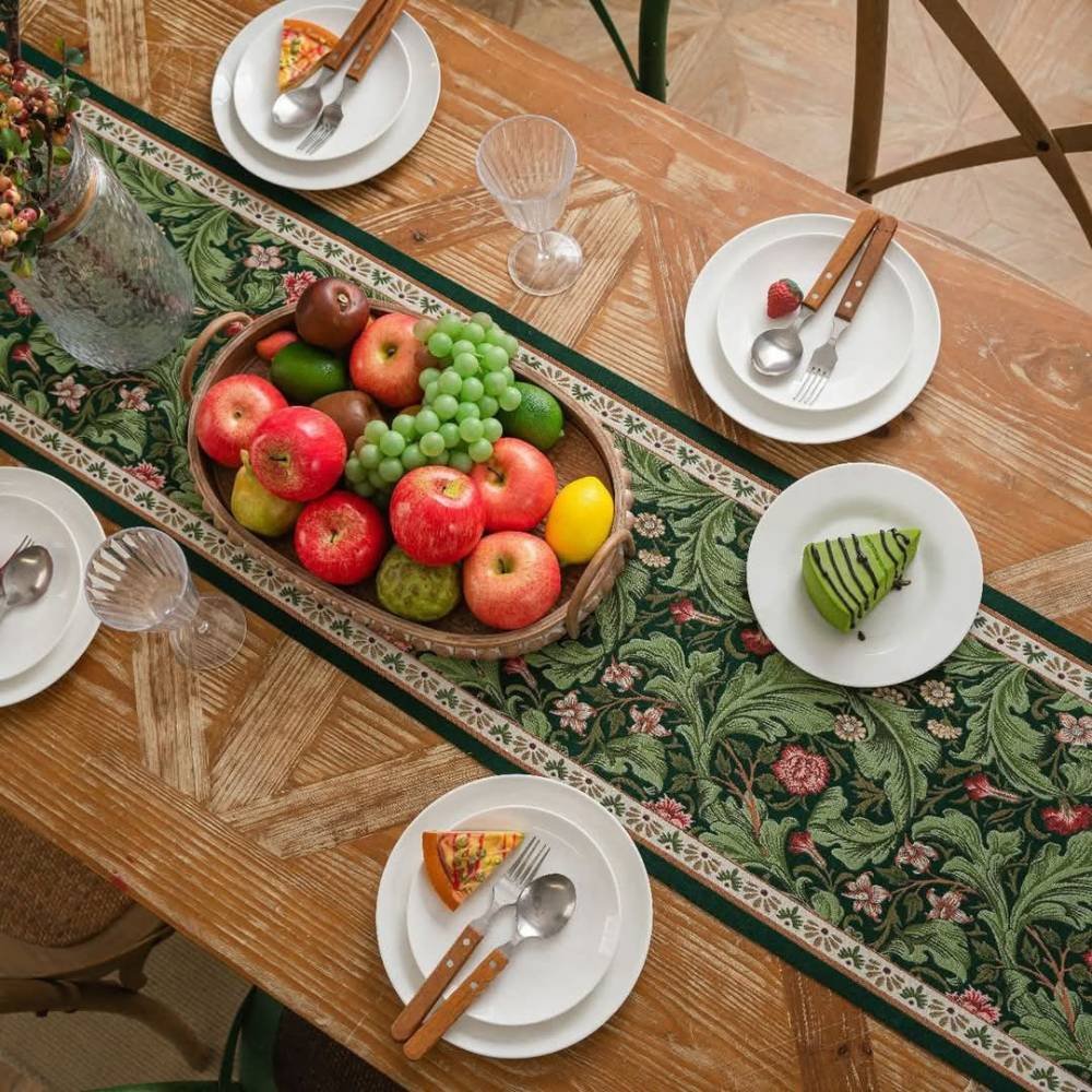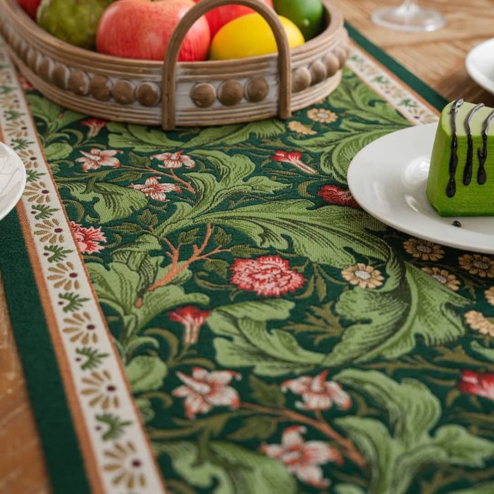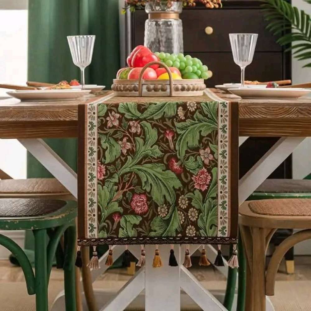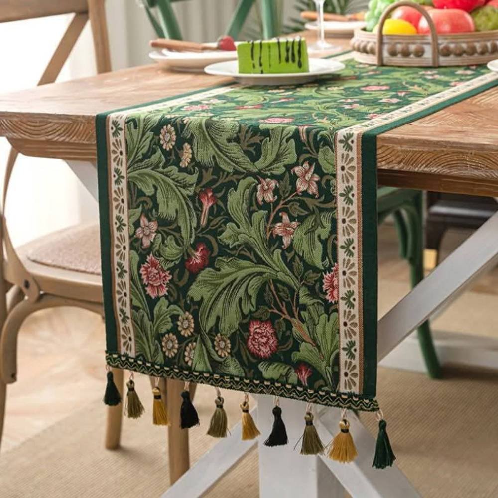 Elevate your dining decor with our Royal Garden Jacquard Table Runners, featuring a lush green botanical pattern with vintage-style florals and ornate tassels. Crafted from durable jacquard fabric, this elegant runner adds charm to any table setting — perfect for holiday dinners, garden parties, or year-round style.