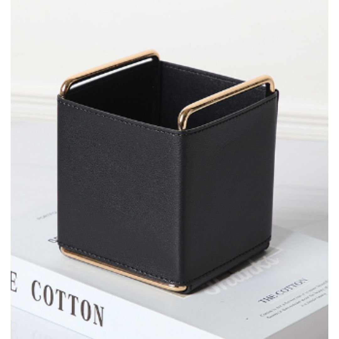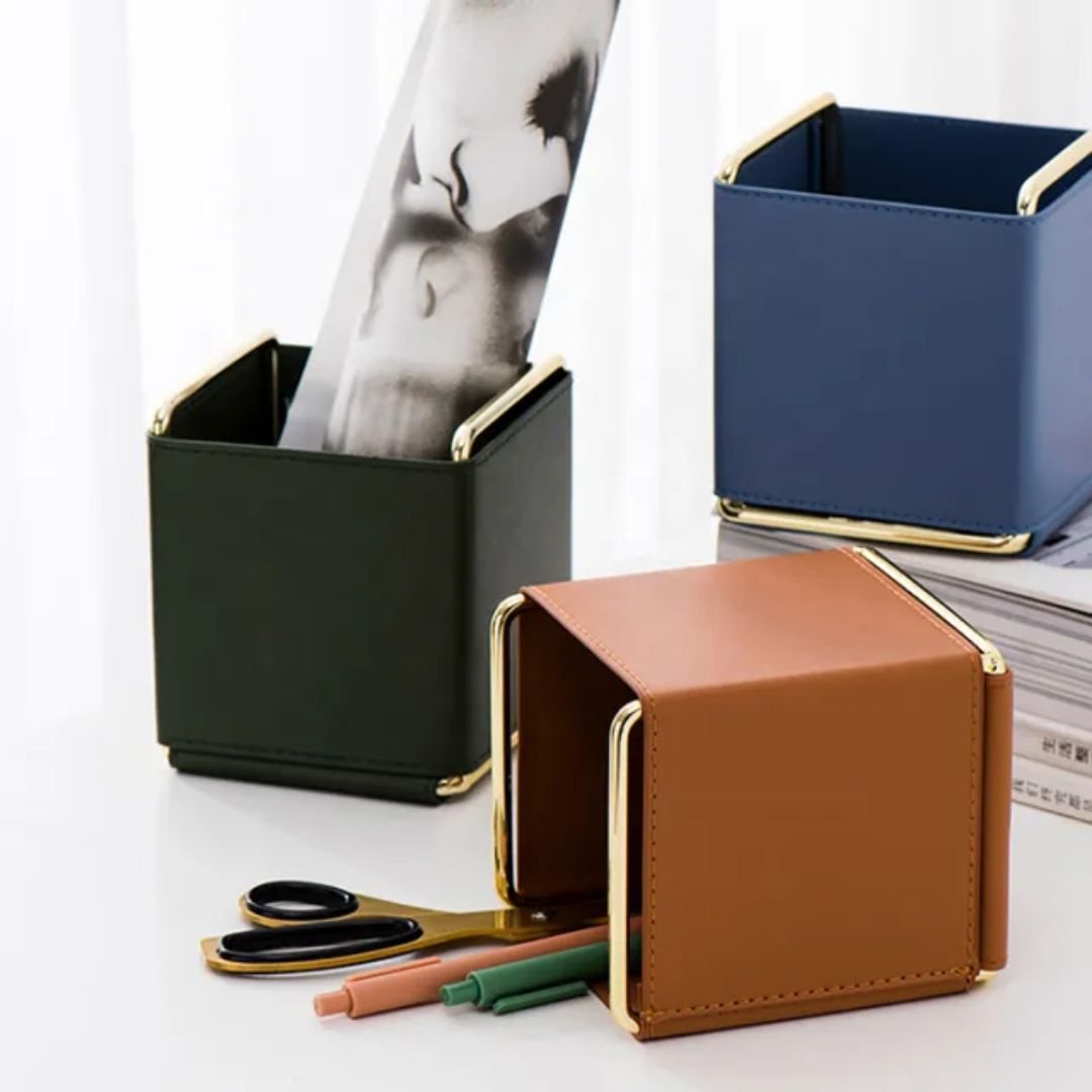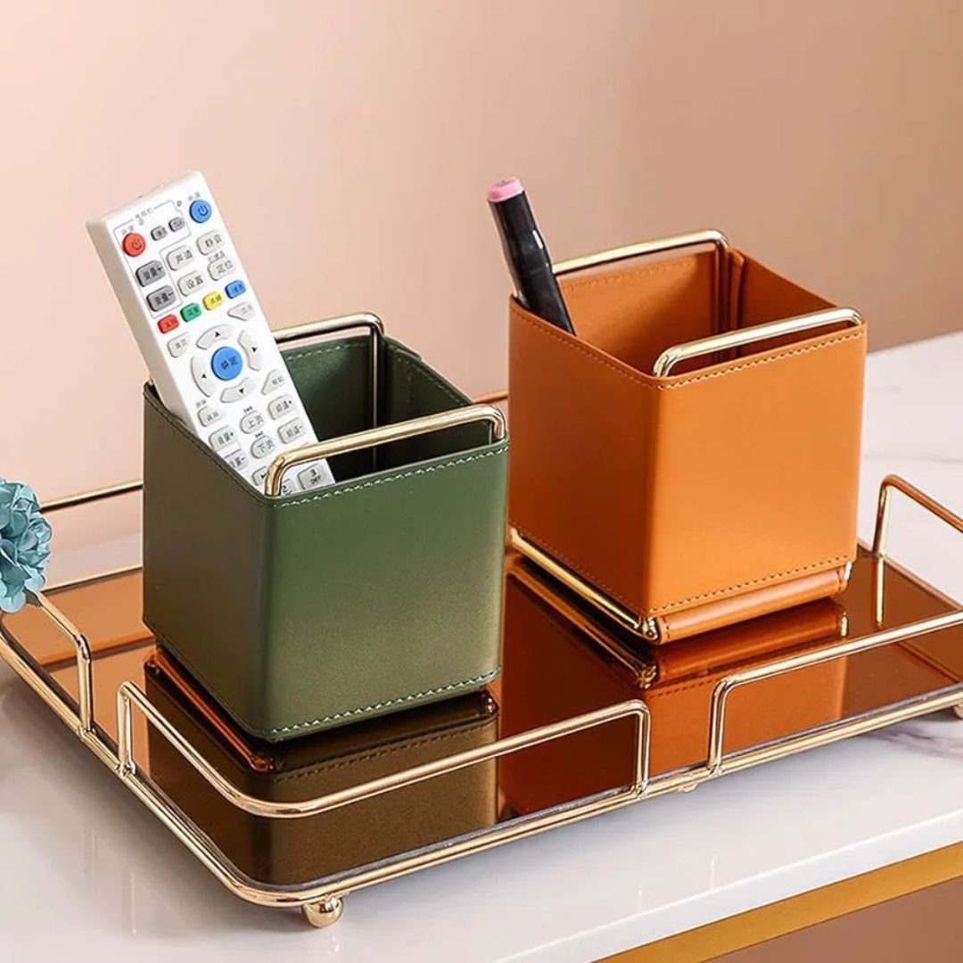 Create a systematic arrangement for your essential items such as makeup, pens, jewelry, cosmetics, sticky notes, paperclips, and other supplies with our Small Leather Tabletop Organizers.