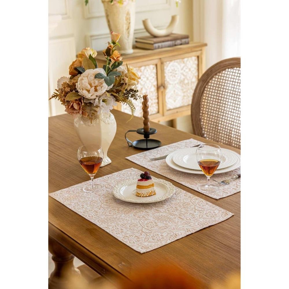 Elevate your dining space with the Soft Embossed Opulence Placemats. The embossed weave adds dimension and depth, giving the fabric a rich, tactile quality without overwhelming the space. The neutral tones complement a wide range of table settings and furniture styles, from traditional wood to contemporary glass. From romantic damask florals and paisley-infused elegance to embossed leaves and branches, geometric medallions, and diamond motifs, each design brings a distinct charm. Furthermore, beyond its aesthetic appeal, it also protects your table from scratches, spills, and heat, serves as a subtle focal point for candles, vases, and centerpieces, and adds tactile dimension to every setting.