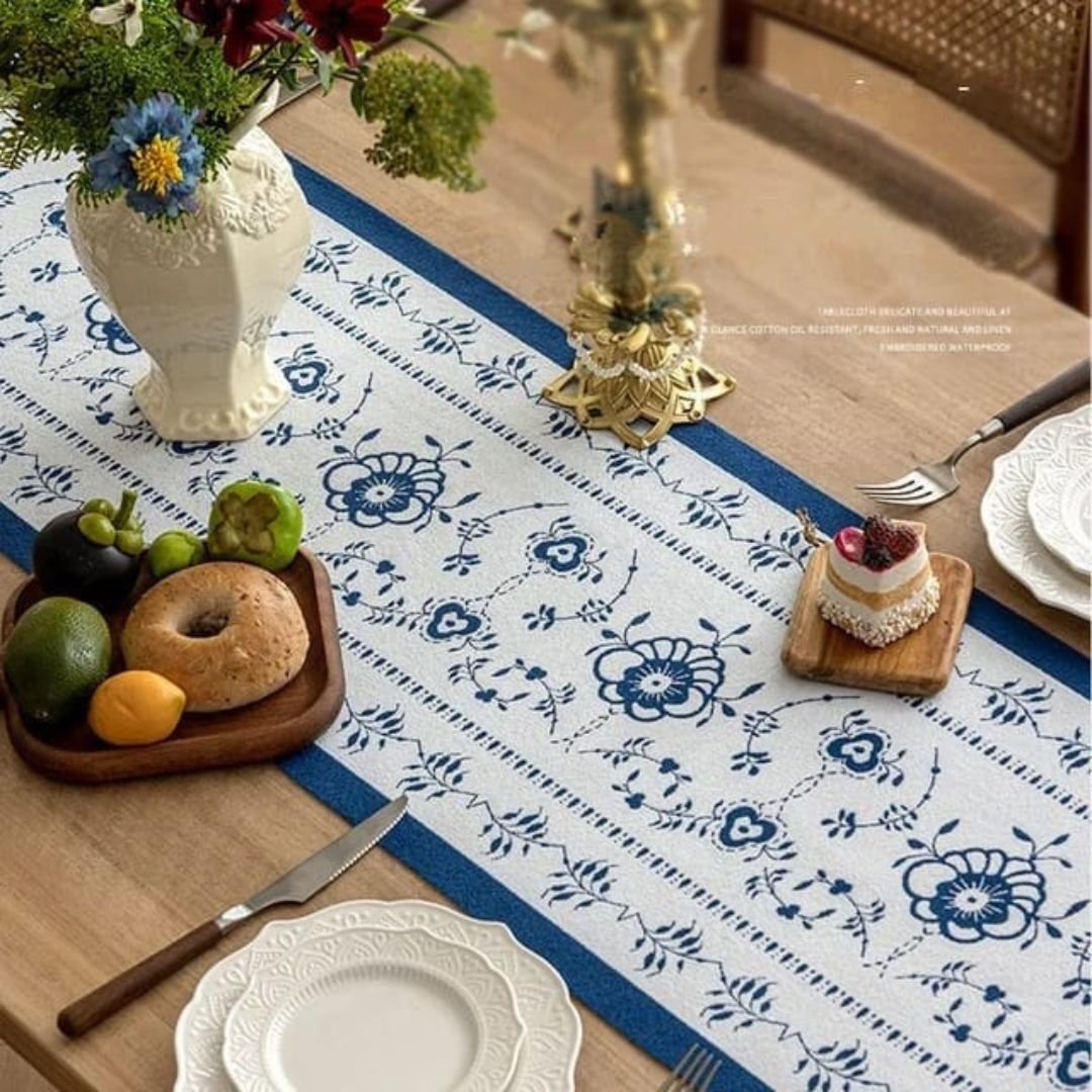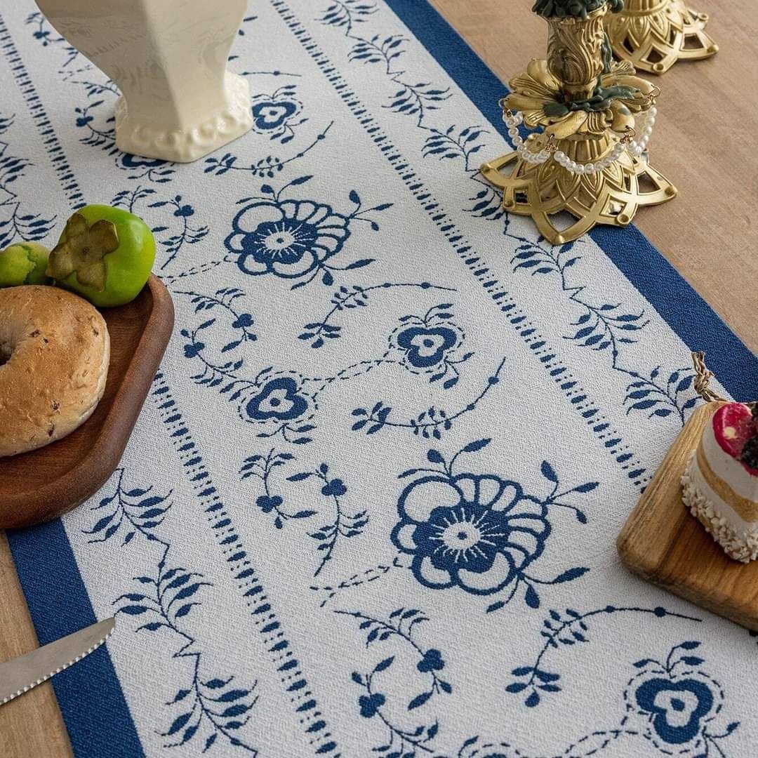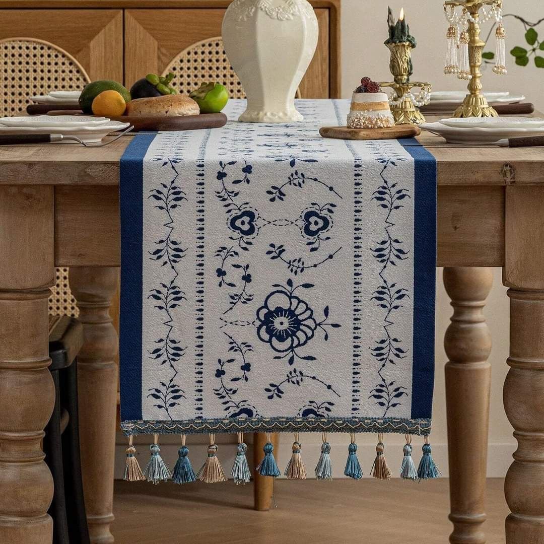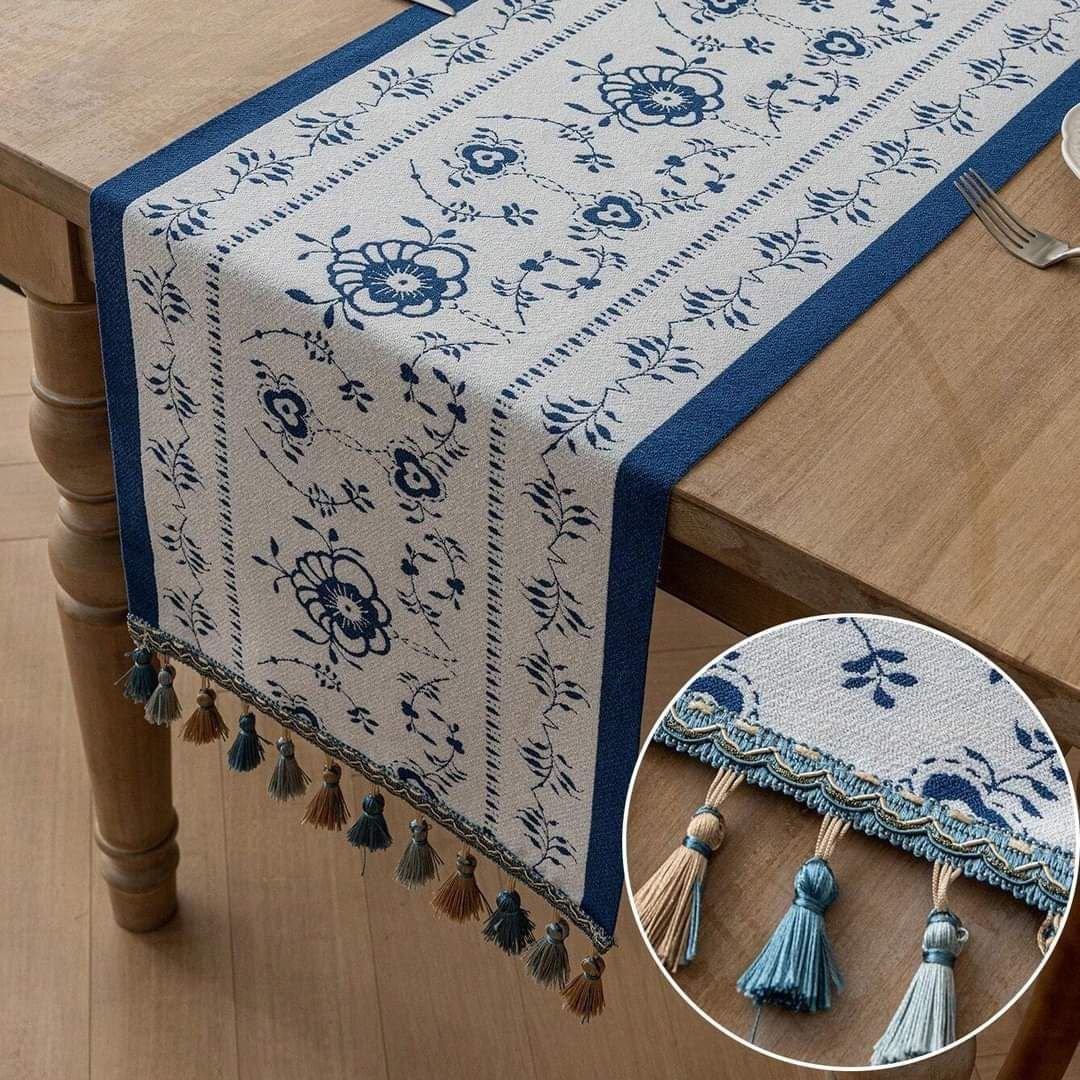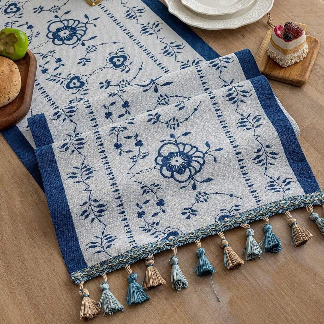 Our Spring FLoral Leaf Jacquard Table Runner has a blue and white background and is decorated with floral designs all over. The playfully positioned flower branches with elaborately decorated flowers and leaves give this elegant runner an extra luxurious look and feel.