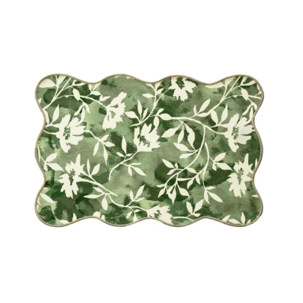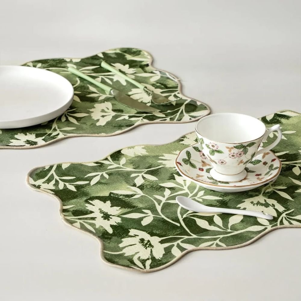 Its watercolor-style floral print in soft sage and deep olive feels hand-painted, adding a breath of freshness to every setting. Furthermore, it is crafted from a durable polyester-cotton blend with a smooth, heat-tolerant backing, which protects your furniture while showcasing its natural surface. Finished with scalloped edges and fine stitching, it turns everyday meals into gentle moments of elegance — a true portrayal of spring’s quiet beauty.