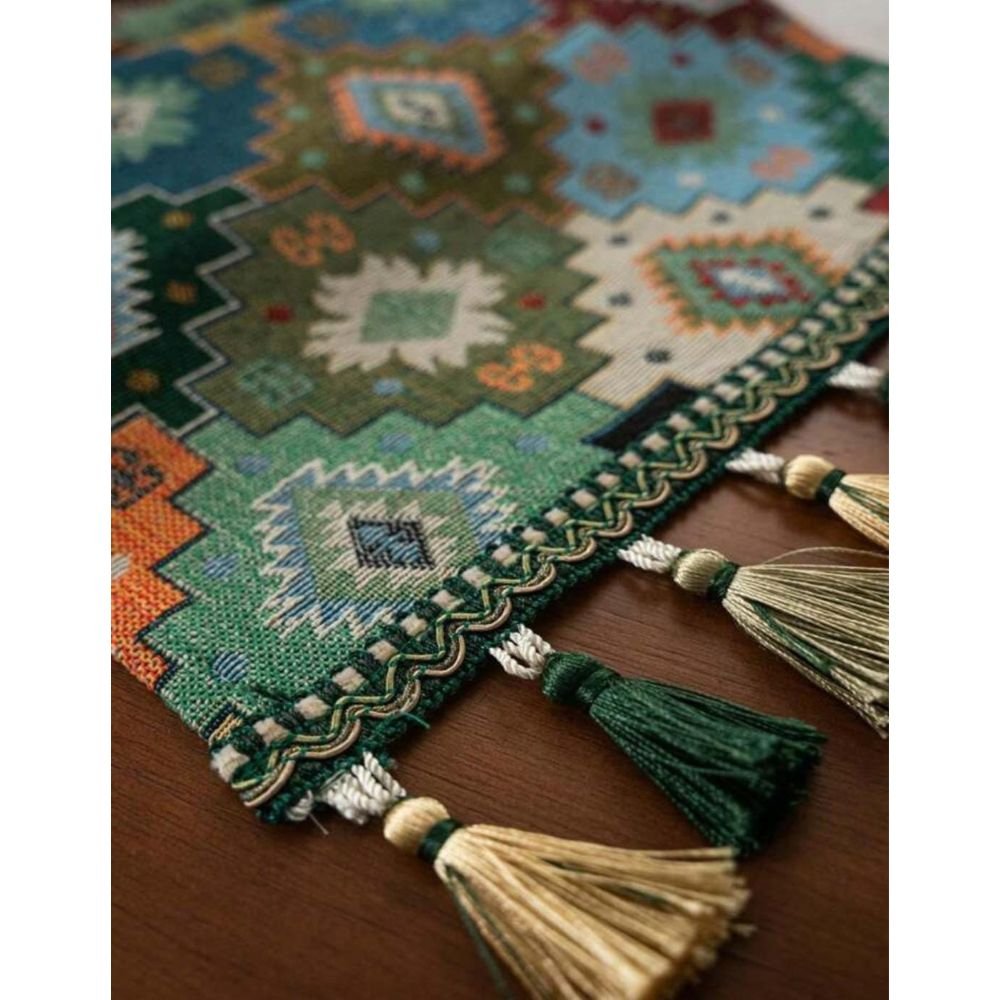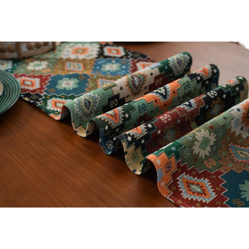 Meet the Tribal Echo Table Runner. Rooted in ancient kilim artistry, the Tribal Echo Table Runner showcases bold geometric motifs and a richly grounded, earthy palette. It adds warmth, cultural depth, and tactile charm to any setting, effortlessly enhancing wooden tables and curated interiors. Whether layered beneath fruit bowls, candle arrangements, or fine serveware, it’s a statement piece designed for boho, rustic-luxe, and globally inspired homes.