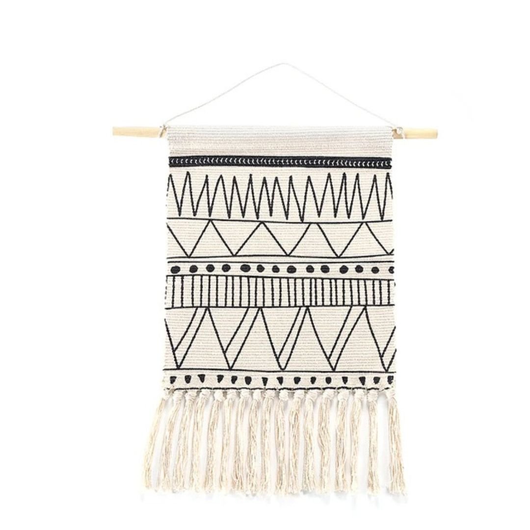 Our Urban Boho Style Wall Hanging features geometric black patterns on a thick white woven fabric. The bottom is adorned with long, loose fringes, giving it a handmade, artisanal look. Neutral tones with black patterning make it versatile for various decor styles, especially minimalist, Scandinavian, or boho interiors.