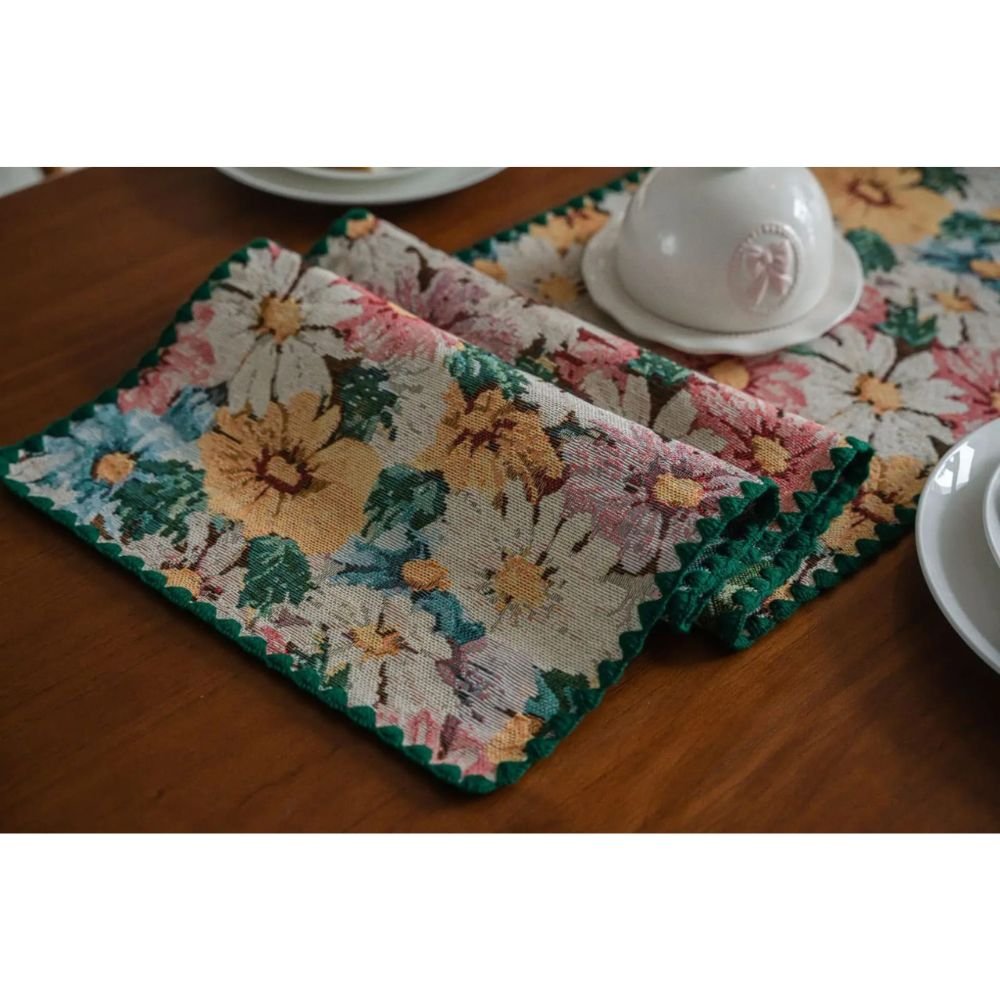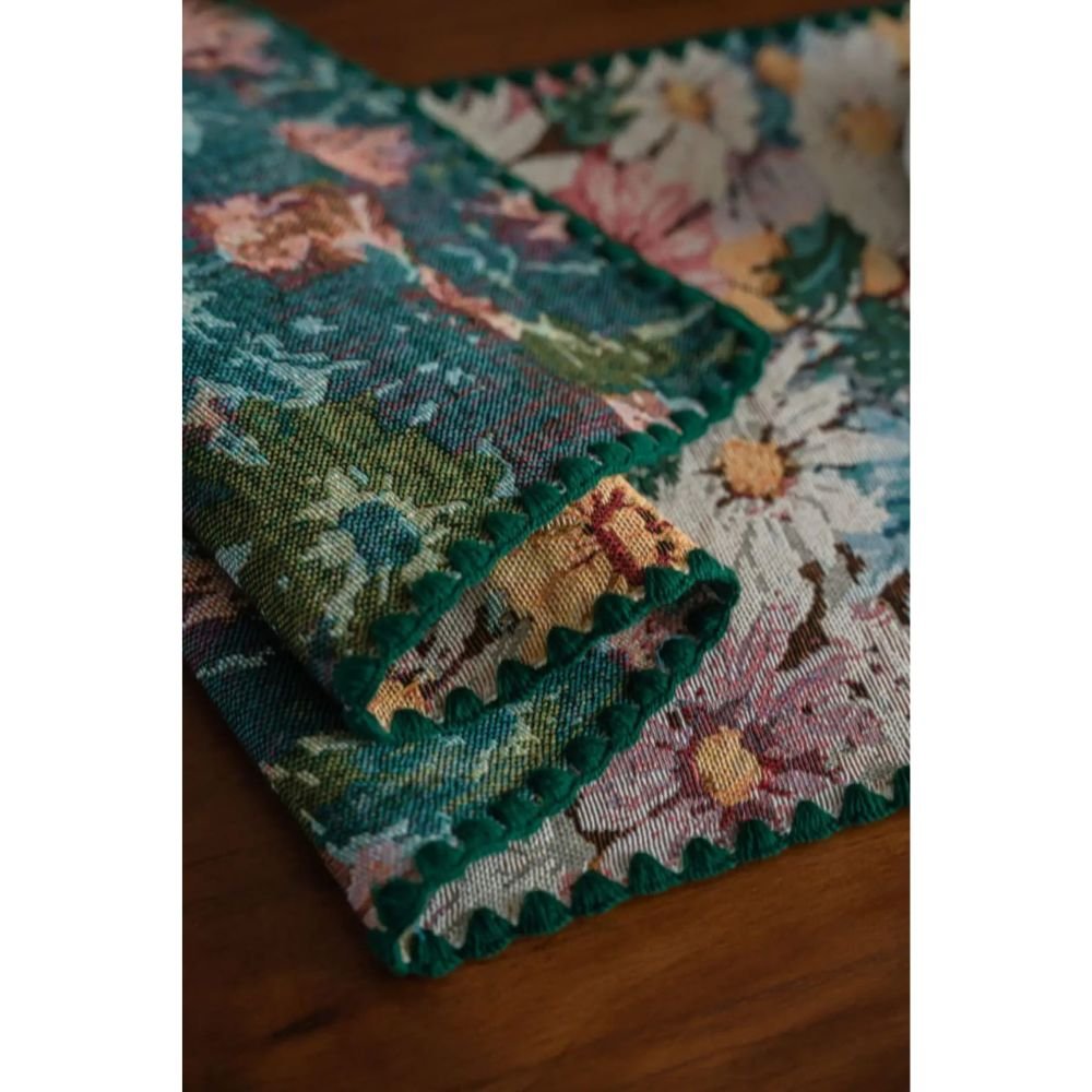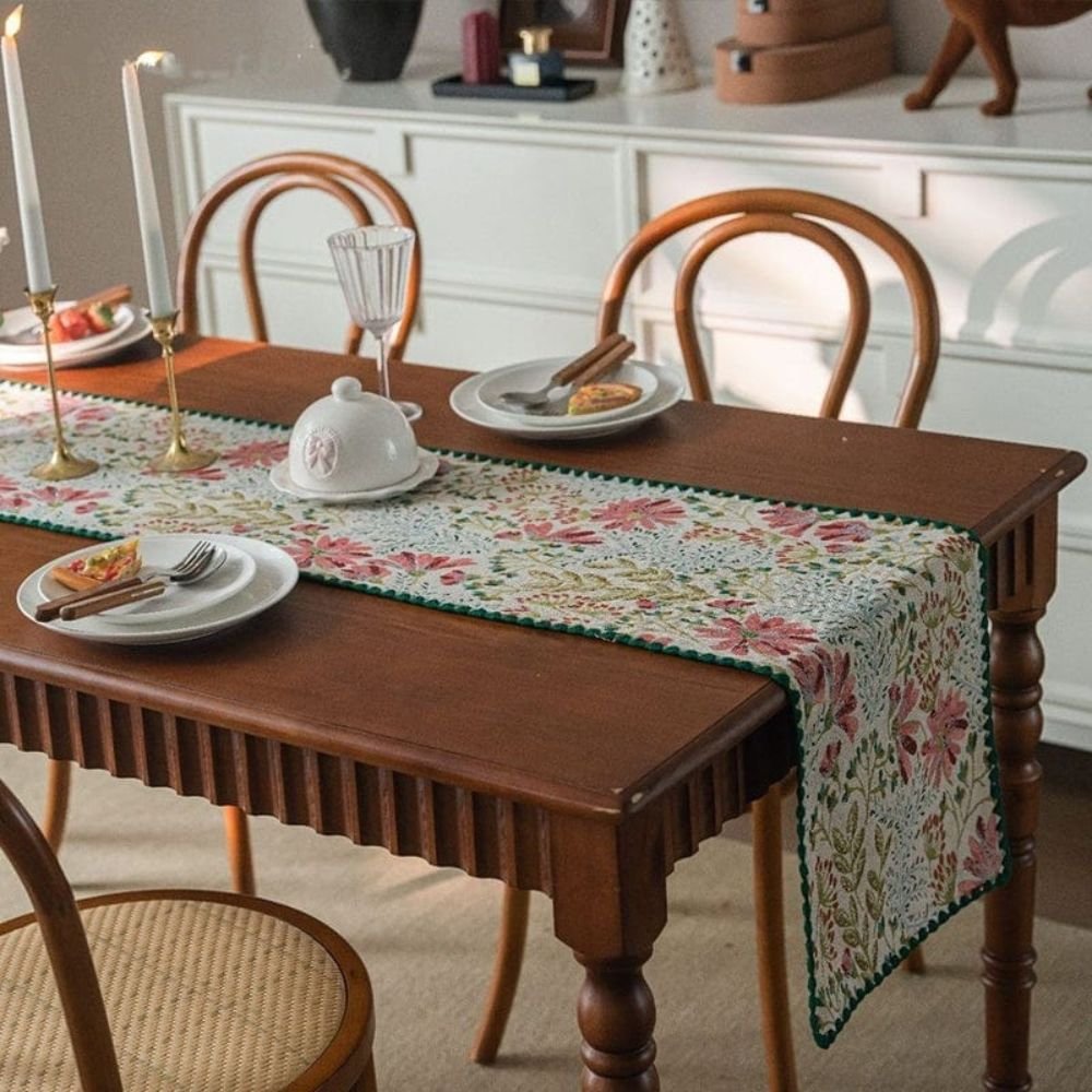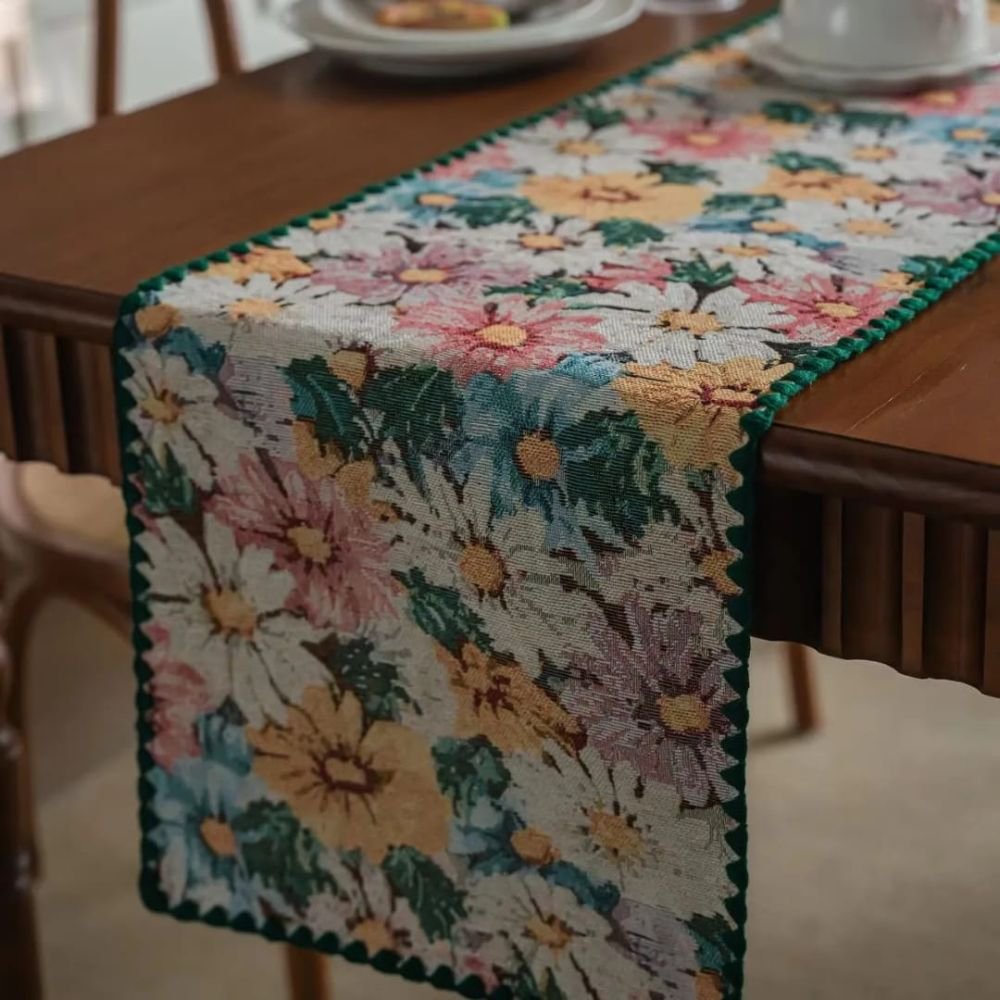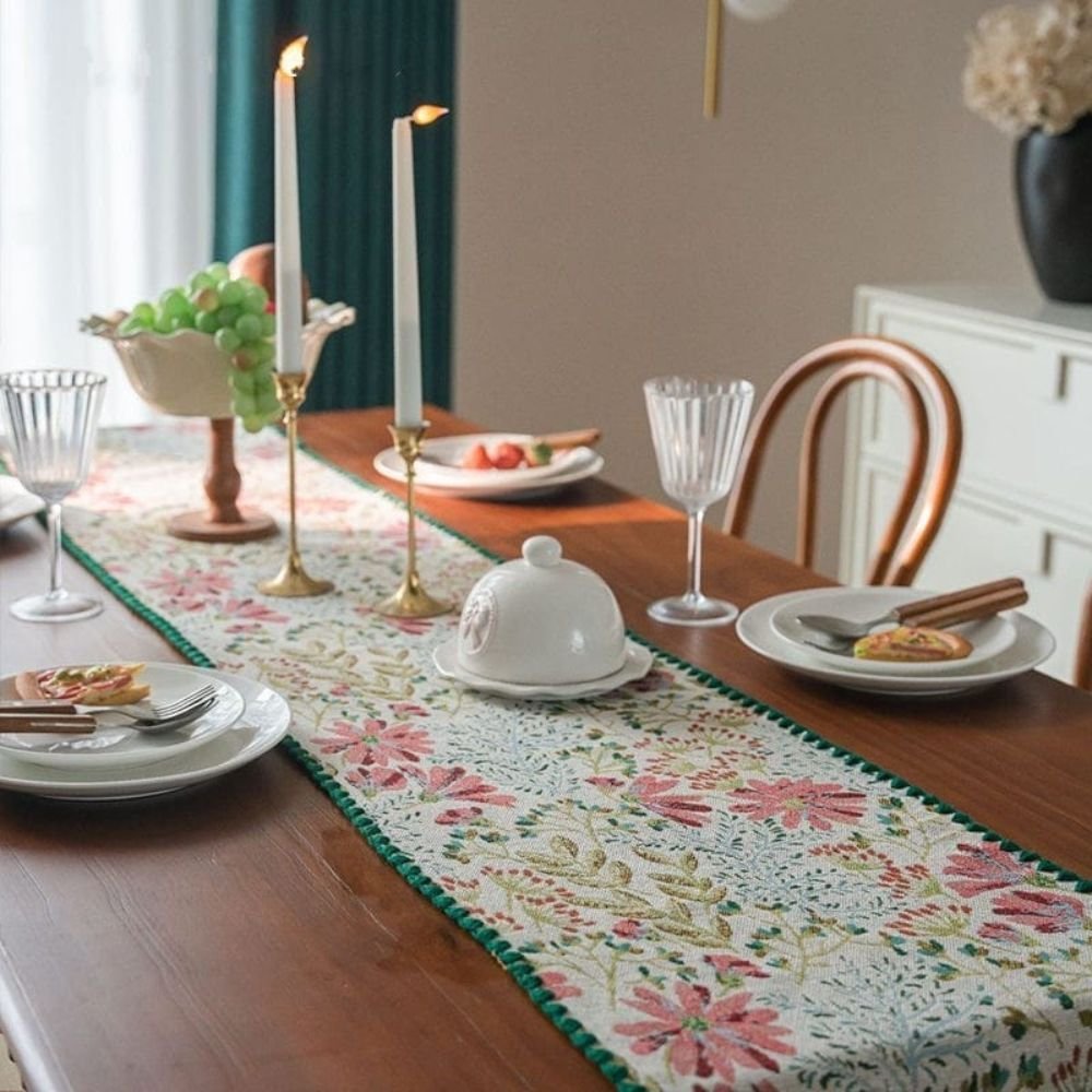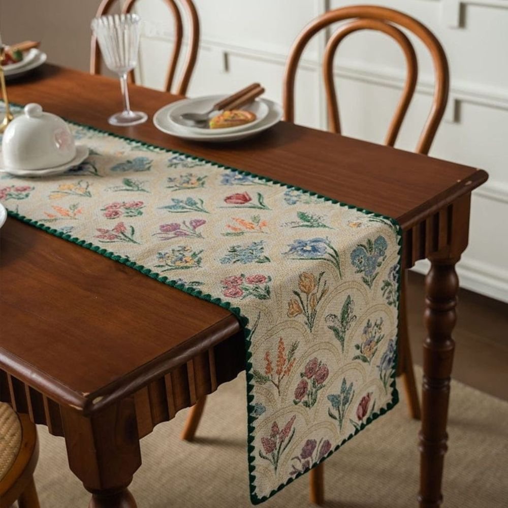Meet the Verdure Borderline Floral Table Runner, a tapestry of botanical beauty framed by a bold green scalloped edge. Whether styled on a dining table, console, or dresser, this runner strikes the perfect balance between cozy charm and refined elegance. Delicate wildflowers, garden blooms, and vintage-inspired florals are woven into every thread. Offering more than just décor, they tell a seasonal story. A must-have for those who appreciate thoughtful details, and a thoughtful gift for those who deserve them. Suitable for both everyday use and seasonal styling.