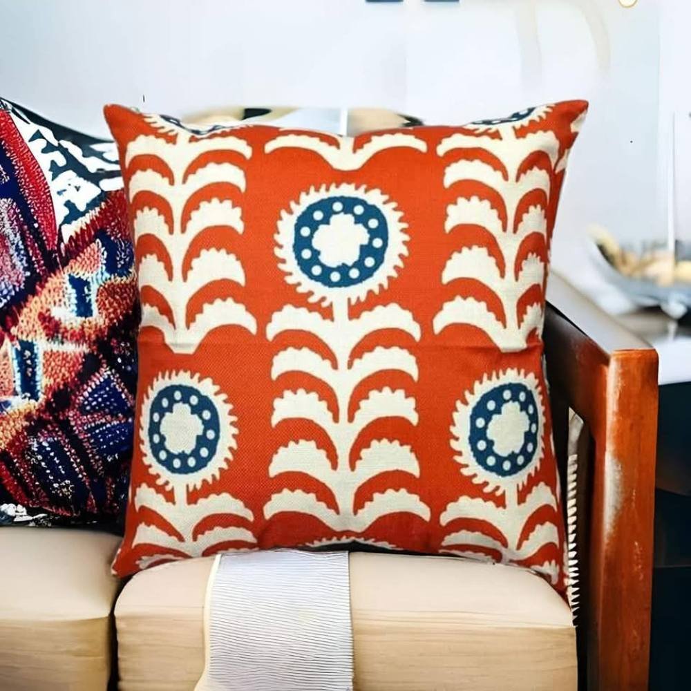 Elevate your space in seconds with our Vibrant Sunleaf Cushion Covers, where rich teal, olive green, and warm burnt orange meet in a striking Floral weave. Inspired by tribal symmetry and refined through modern minimalism, it’s crafted to command attention. Whether styled on a sofa, accent chair, or outdoor bench, this piece brings bold elegance to every corner.