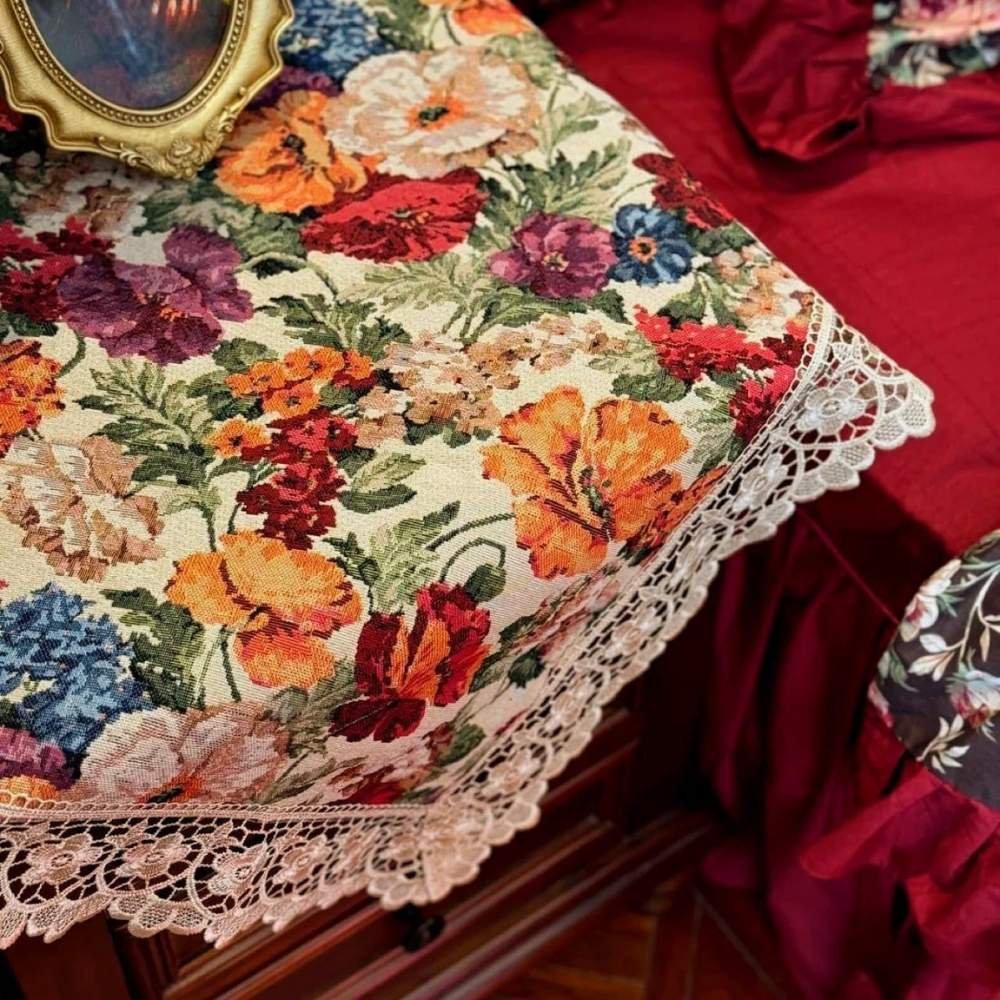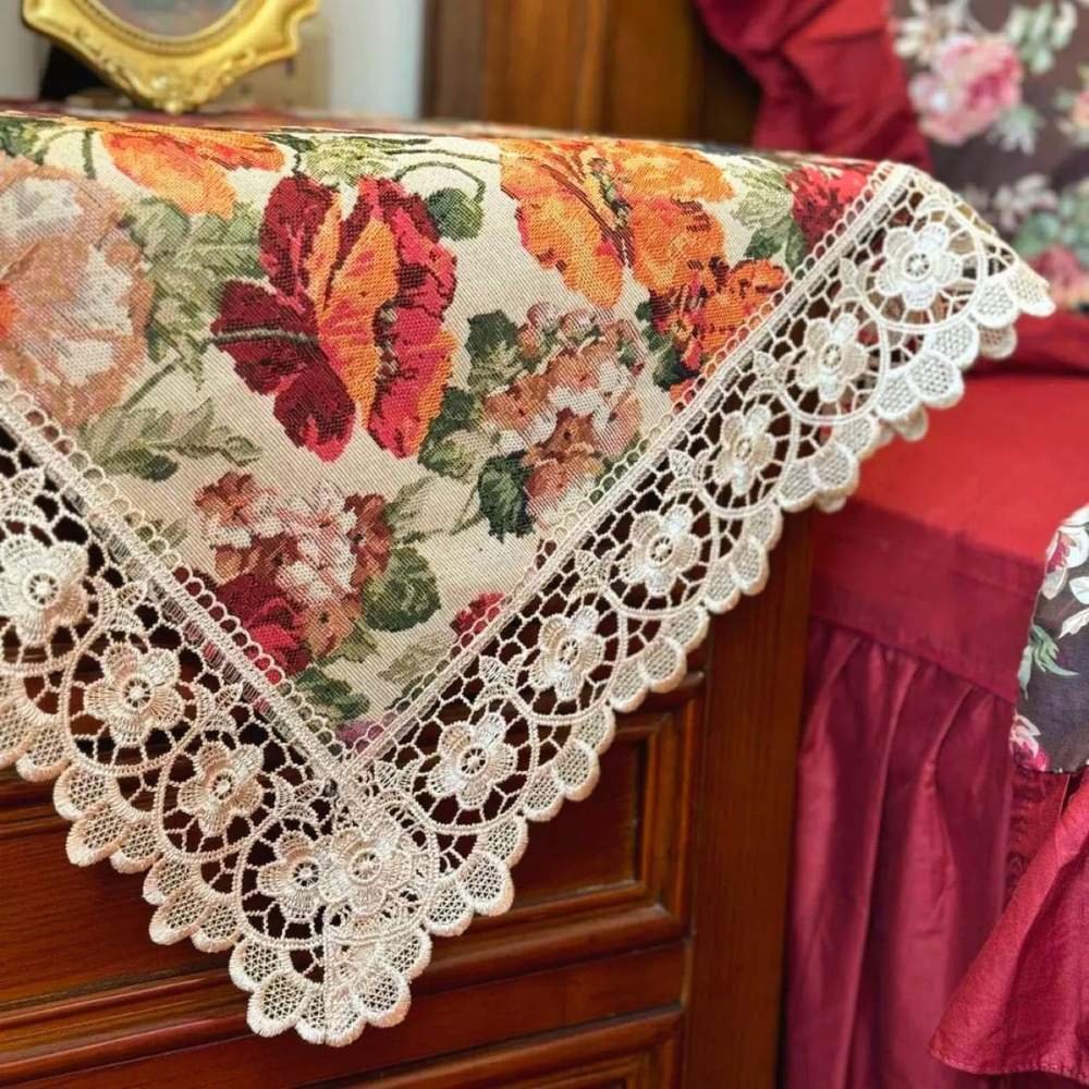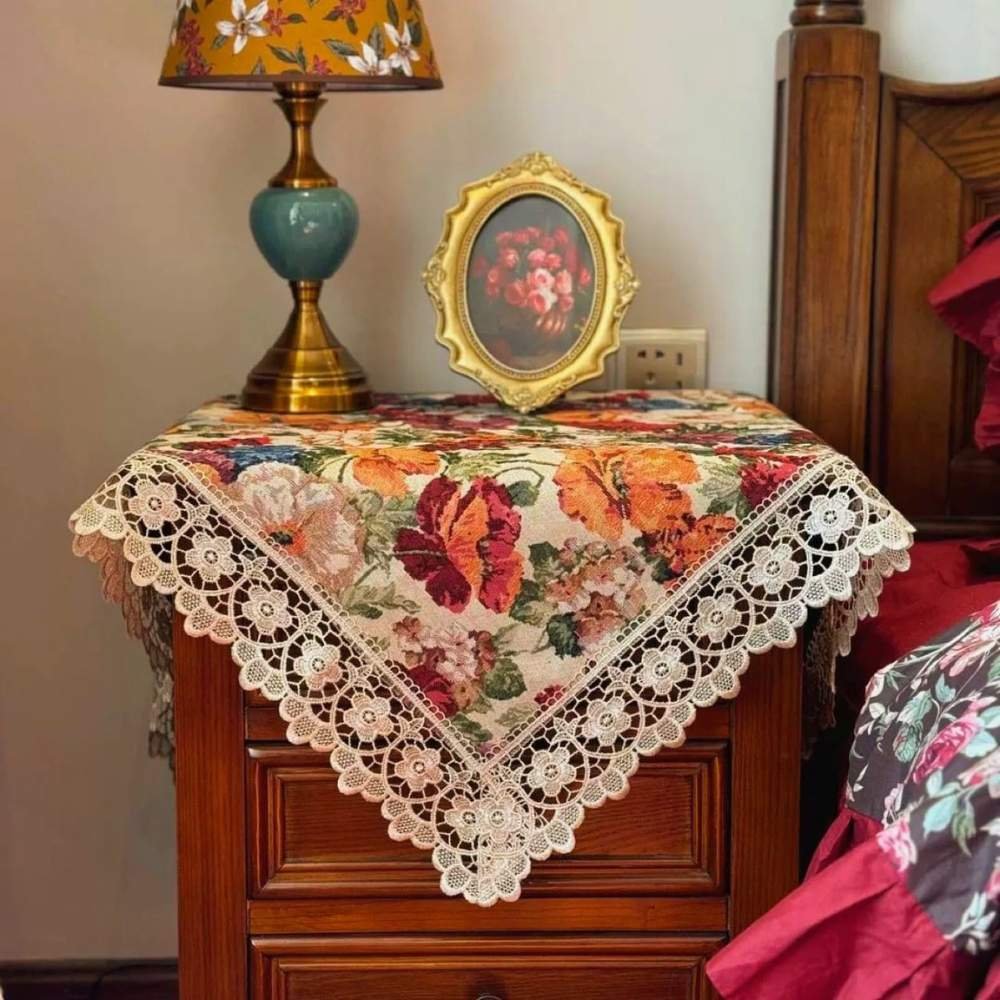 Featuring a rich floral tapestry and intricate golden lace edges, the Victorian Gold Lace Nightstand Cover is designed to elevate and protect your nightstand. Perfect for home décor enthusiasts, interior designers, and anyone seeking classic sophistication with a royal touch. This isn’t just a cover, it’s a tribute to timeless elegance. Inspired by the grandeur of the Victorian era (1837–1901), when homes were adorned with luxurious textiles and ornate furniture. They channel the legacy of a time when lace and covers were more than decor, and symbols of refined taste